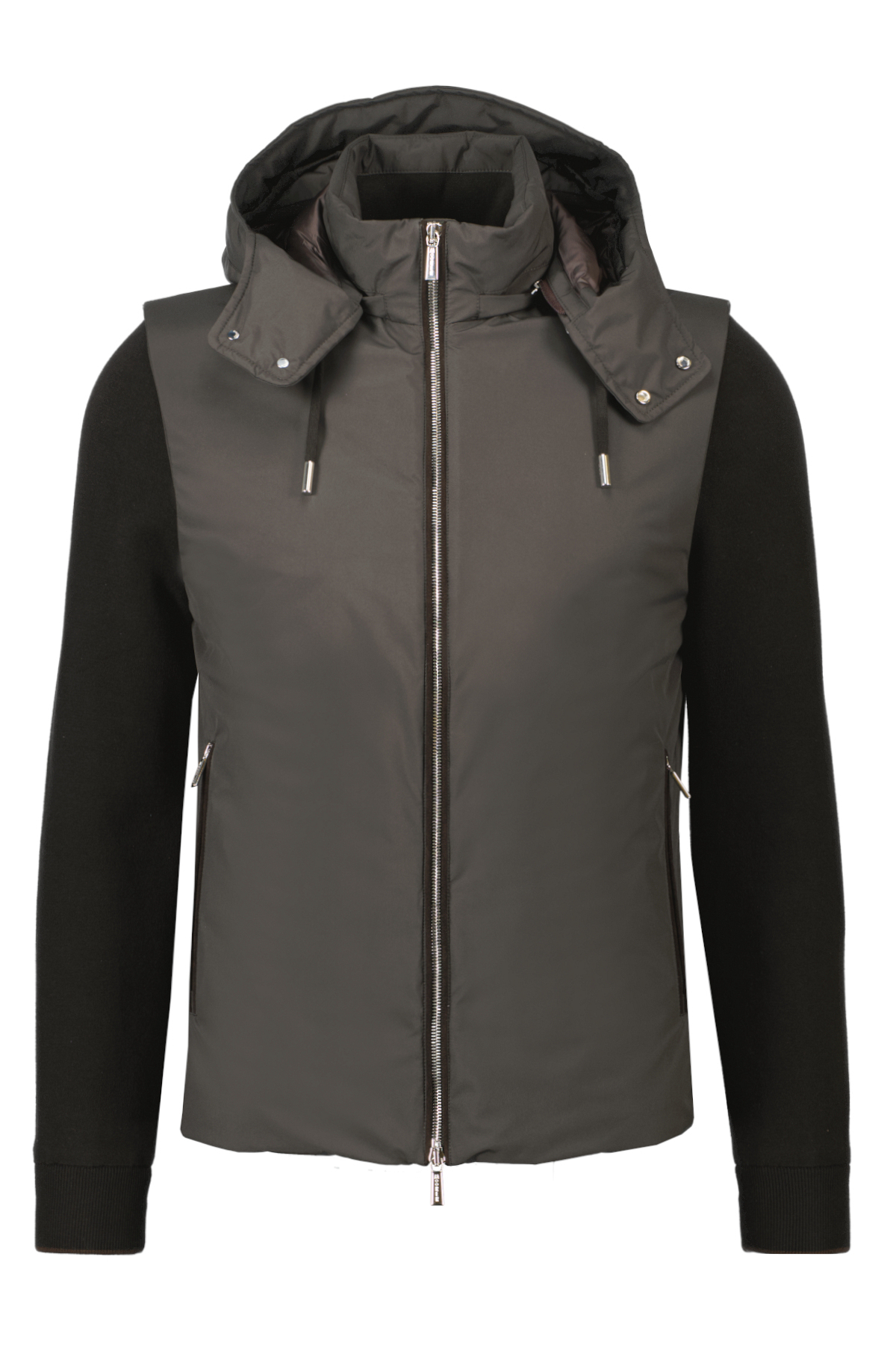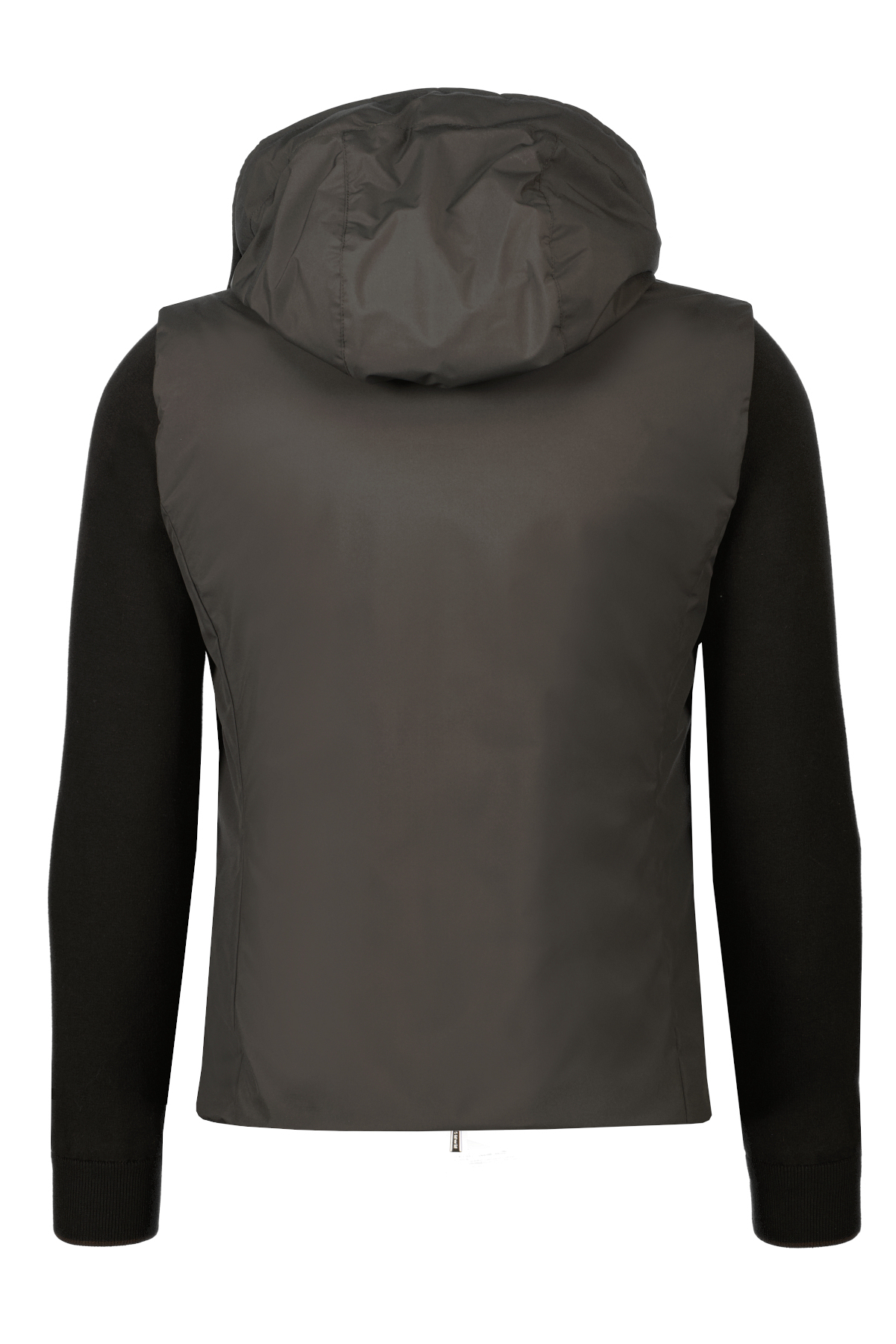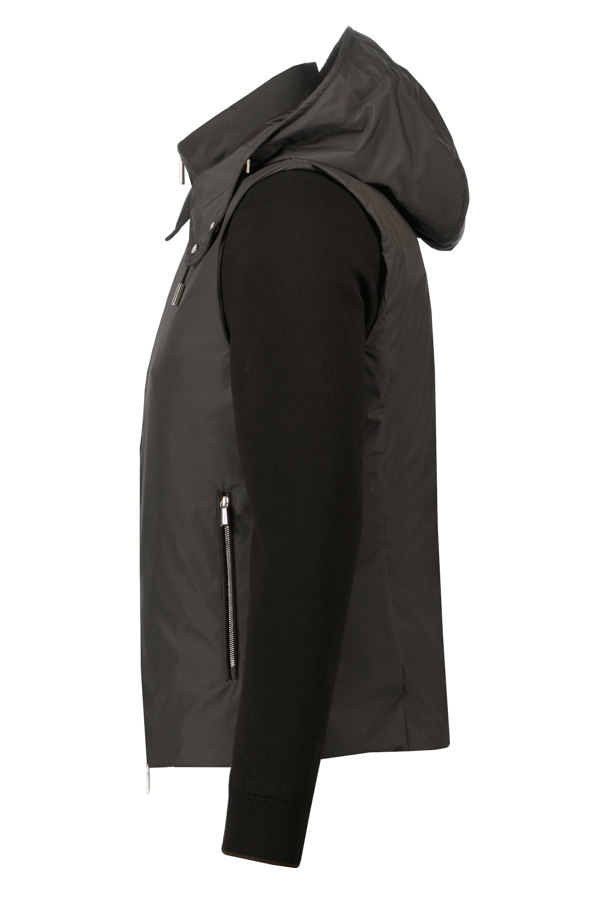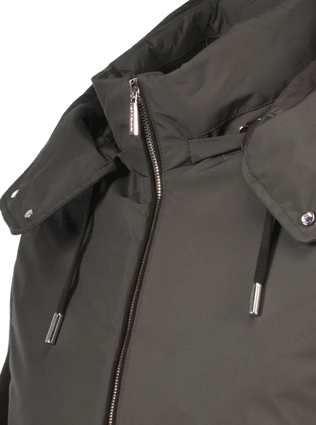 Donkerbruine bomberjack jas voor heren model Evan van Moorer. De bomberjack gemaakt van een mix van materialen met een gladde waterdichte stof op het lichaam en gewatteerd met zeer licht dons. De katoenen effen gebreide mouwen, die het kledingstuk in een gilet veranderen, zijn afneembaar. Afneembare capuchon met een gladde buitenkant en tape om de wijdte aan te passen. Sluiting aan de voorkant met dubbele metalen ritssluiting.