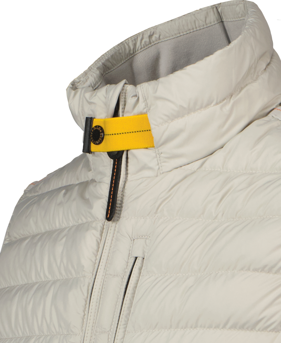 Lichtgrijze bodywarmer voor heren model Perfect van Parajumpers. De Perfect is een gewatteerde bodywarmer, afkomstig uit de met dons gevulde Super Lightweight-collectie, gemaakt van polyester tafzijde met matte afwerking. Heeft een sluiting aan de voorkant met dubbele rits, drie zakken met rits en een binnenzak met klittenband, de onderkant en armsgaten is afgezet met lycra, heeft geribde zijpanelen en binnenkraag en heeft een Parajumpers-patch in het midden op de achterkant van de hals en sluiting met de bekende gele strook op de hals.