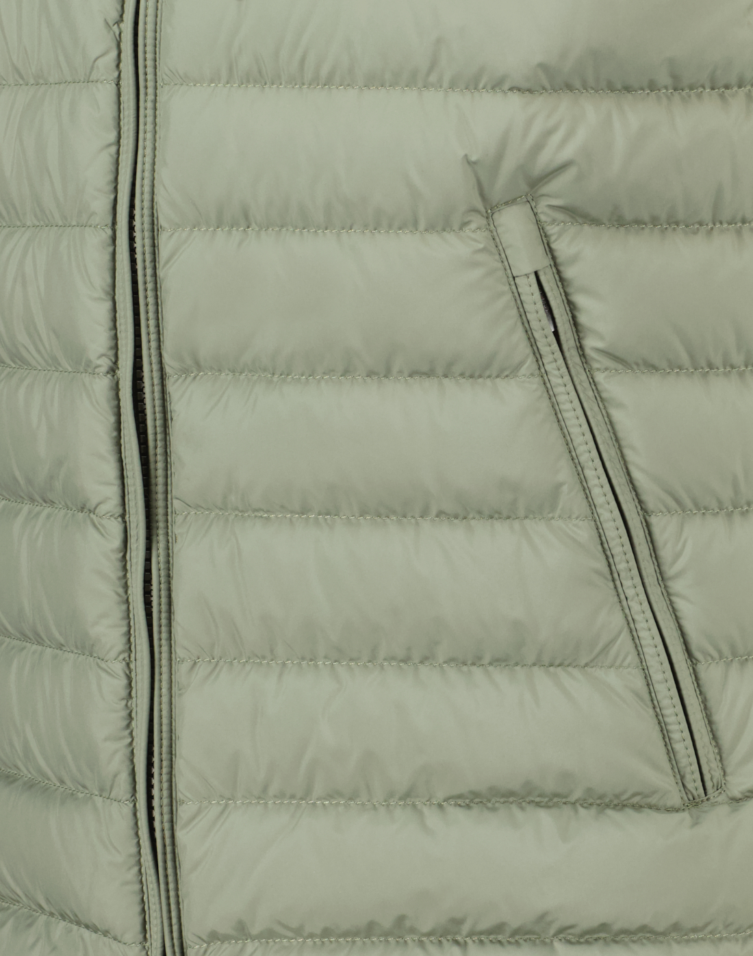 Groengrijze bodywarmer voor heren model Perfect van Parajumpers. De Perfect is een gewatteerde bodywarmer, afkomstig uit de met dons gevulde Super Lightweight-collectie, gemaakt van polyester tafzijde met matte afwerking. Heeft een sluiting aan de voorkant met dubbele rits, drie zakken met rits en een binnenzak met klittenband, de onderkant en armsgaten is afgezet met lycra, heeft geribde zijpanelen en binnenkraag en heeft een Parajumpers-patch in het midden op de achterkant van de hals en sluiting met de bekende gele strook op de hals.