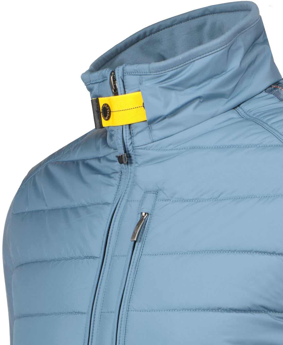 Blauwe jas model Elliot voor heren van Parajumpers. De jas heeft een tweewegritssluiting, beschikt over drie voorzakken met ritssluiting en twee binnenzakken. Heeft een geribde onderkant, zijkanten en manchetten, beschikt over details zoals de patch en gele tape. De stof is een down-proof polyester taft met matte afwerking en een waterafstotende behandeling; terwijl de tweede stof een katoenmixfleece is met een diagonale structuur en een licht geborstelde achterkant. De vulling is polyester. 75% van de jas is gemaakt van gerecyclede stof.