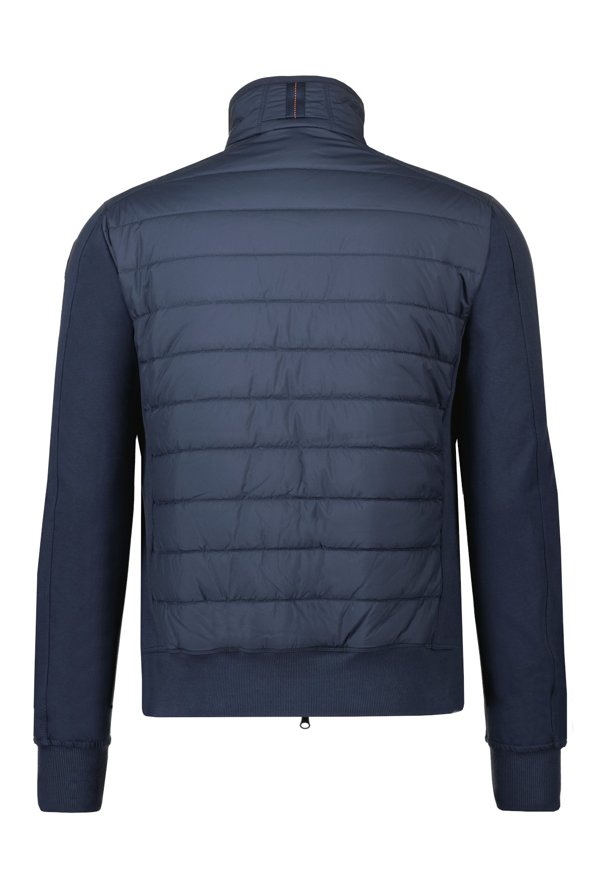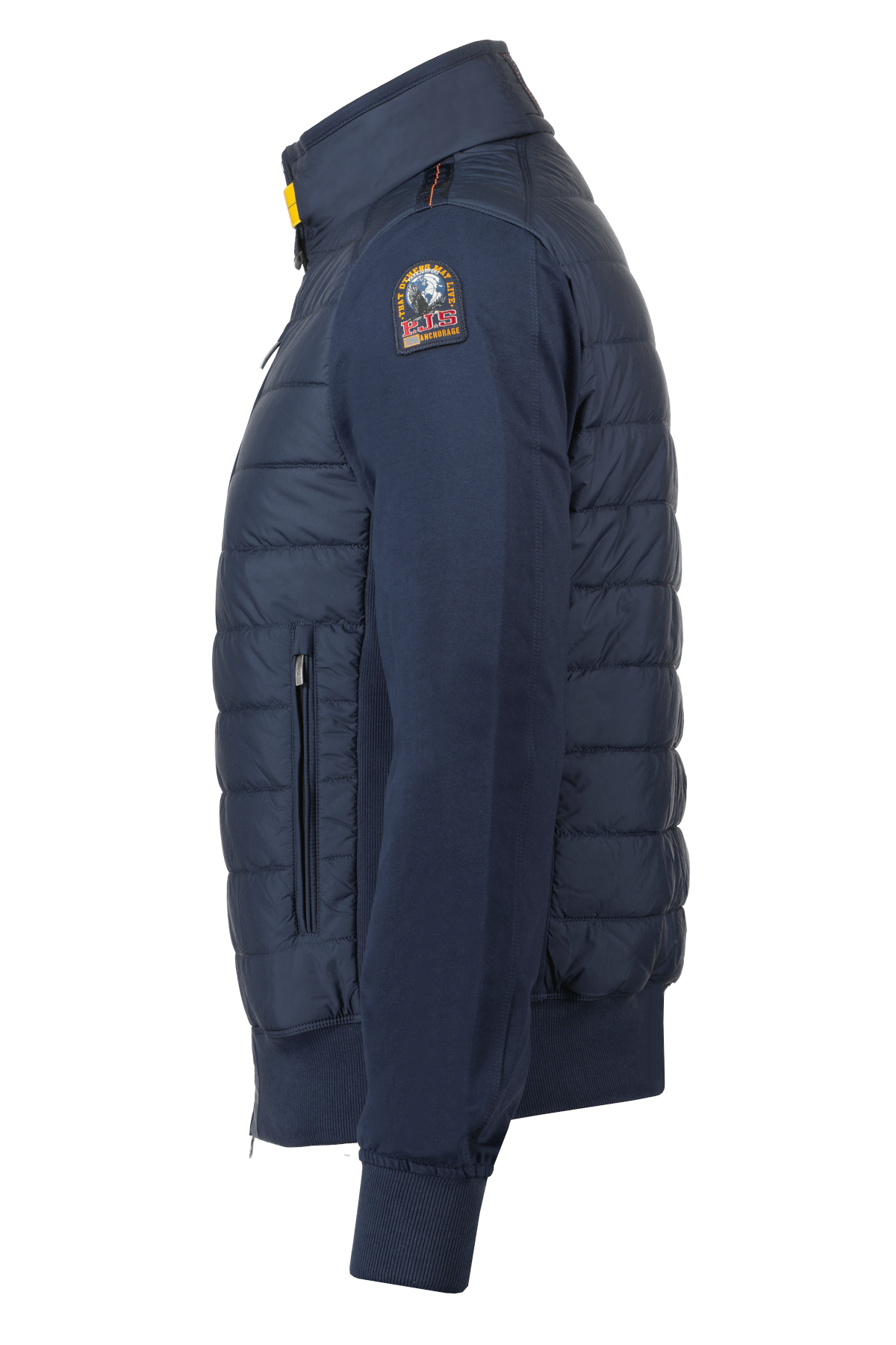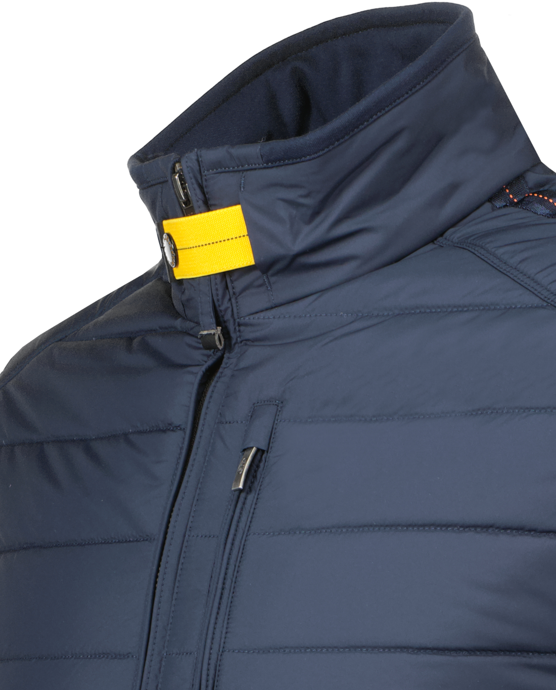 Donkerblauwe jas model Elliot voor heren van Parajumpers. De jas heeft een tweewegritssluiting, beschikt over drie voorzakken met ritssluiting en twee binnenzakken. Heeft een geribde onderkant, zijkanten en manchetten, beschikt over details zoals de patch en gele tape. De stof is een down-proof polyester taft met matte afwerking en een waterafstotende behandeling; terwijl de tweede stof een katoenmixfleece is met een diagonale structuur en een licht geborstelde achterkant. De vulling is polyester. 75% van de jas is gemaakt van gerecyclede stof.