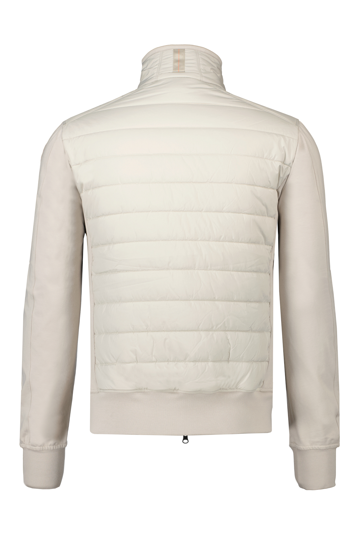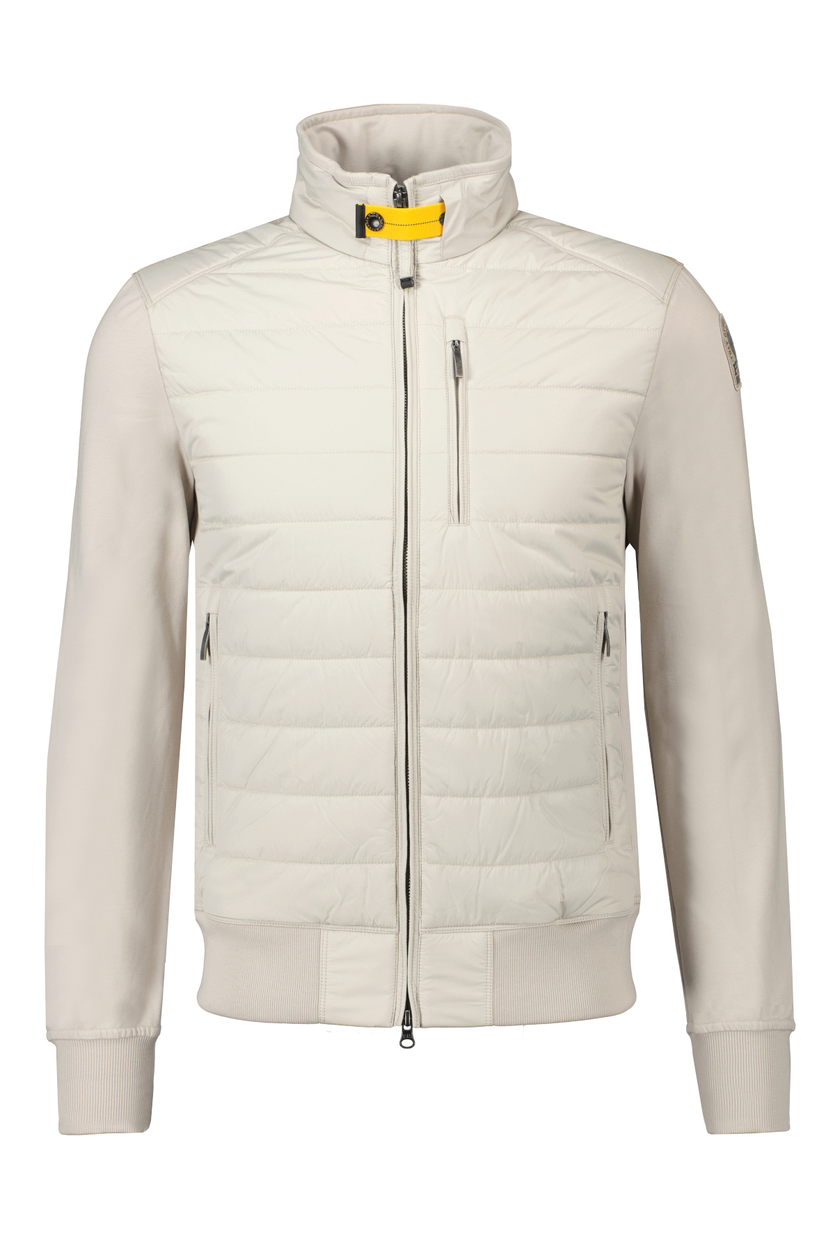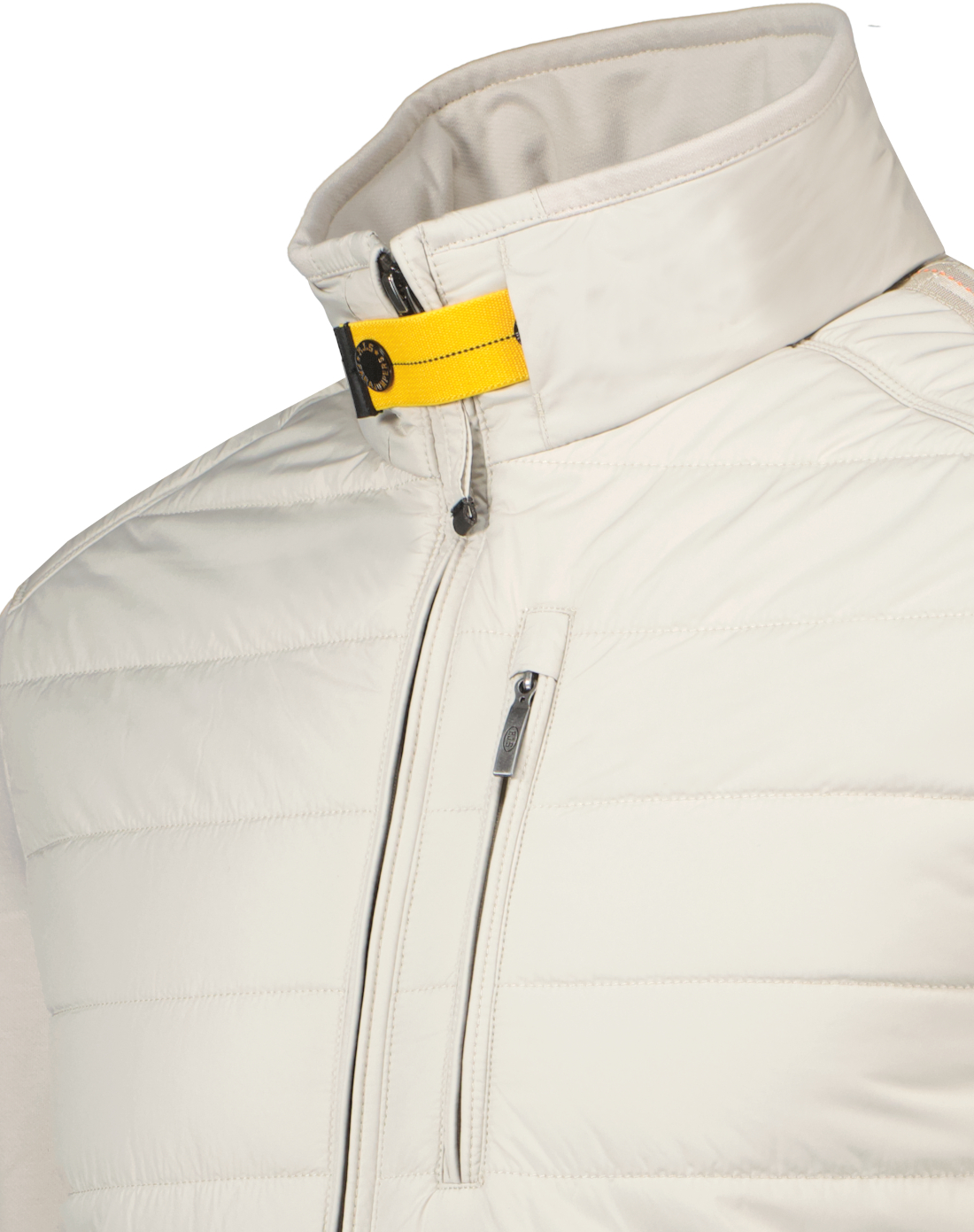 Lichtgrijze jas model Elliot voor heren van Parajumpers. De jas heeft een tweewegritssluiting, beschikt over drie voorzakken met ritssluiting en twee binnenzakken. Heeft een geribde onderkant, zijkanten en manchetten, beschikt over details zoals de patch en gele tape. De stof is een down-proof polyester taft met matte afwerking en een waterafstotende behandeling; terwijl de tweede stof een katoenmixfleece is met een diagonale structuur en een licht geborstelde achterkant. De vulling is polyester. 75% van de jas is gemaakt van gerecyclede stof.