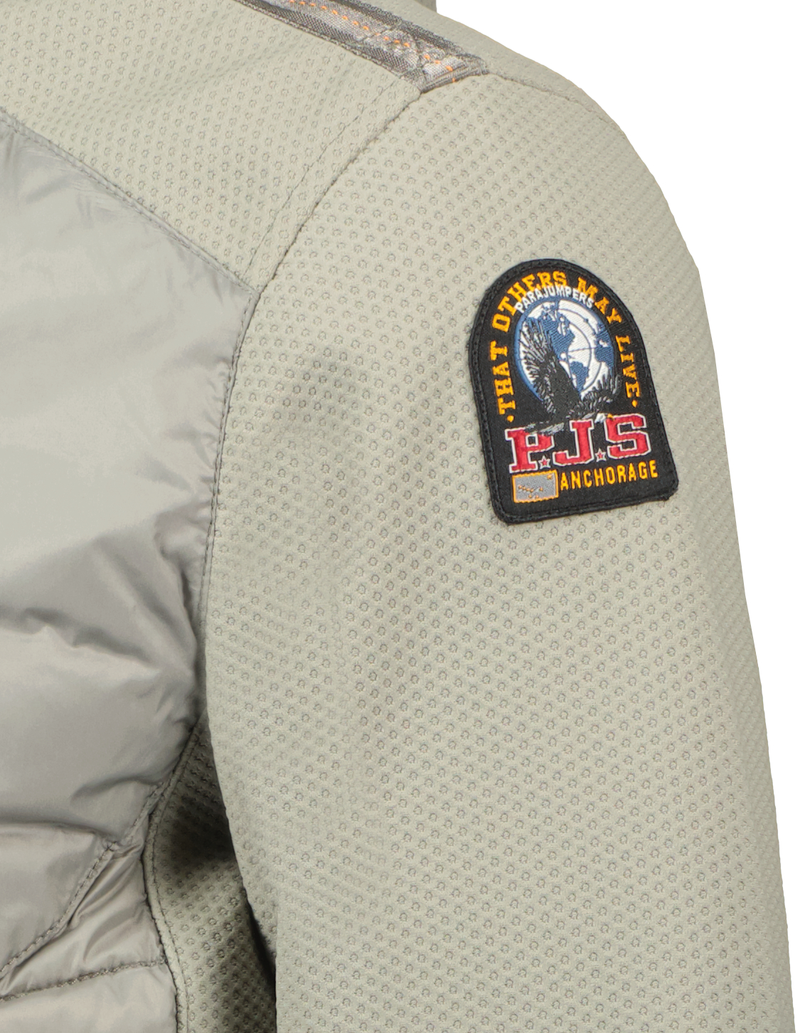 Grijze jas model Nolan voor heren van Parajumpers. Deze jas met capuchon is gemaakt van een superlichte 20 den donsbestendige semi-glanzende tafzijde, 100% nylon; de tweede schaal is een polyester honingraat breisel 80% polyester - 20% elastaan gebonden met polyester jersey, beide met waterafstotende behandeling. De vulling is 100% polyester. Drie zakken aan de voorkant, een klein zakje met ritssluiting aan de achterkant en twee binnenzakken. Rits aan de voorkant. Met lycra afgewerkte manchetten, onderkant, zakken, capuchon. Ventilatieopeningen onder de armen. Iconische gele elastische neksluiting en PJS-patch op de linkermouw.