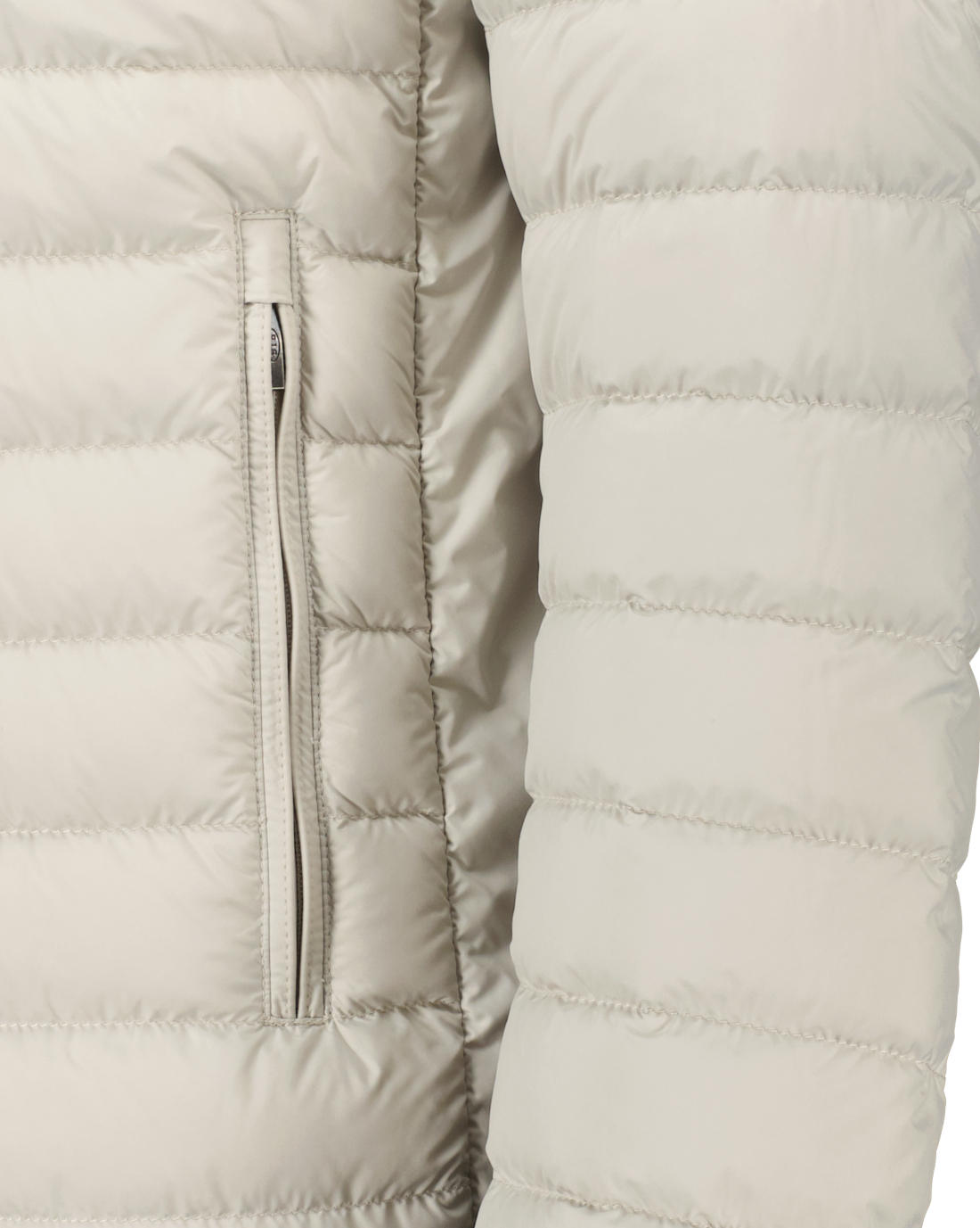 Lichtgrijze jas voor heren model Ugo van Parajumpers voorzien van een dubbele ritssluiting. Op de voorzijde van de jas zitten twee rechte zakken met blinde ritssluiting en een borstzak met ritssluiting op linkerborst. De linkerarm is voorzien van batch met logo PJS. In de kraag zit een ton-sur-ton elastische band en is de kraag tevens voorzien van de welbekende gele sluiting met drukknoop van Parajumpers. De onderkant en beide mouwen van de jas zijn mooi afgewerkt met een elastische band en onderarm ventilatie. De jas is gevoerd met 90% dons en 10% veren en heeft een waterafstotende behandeling ondergaan.
