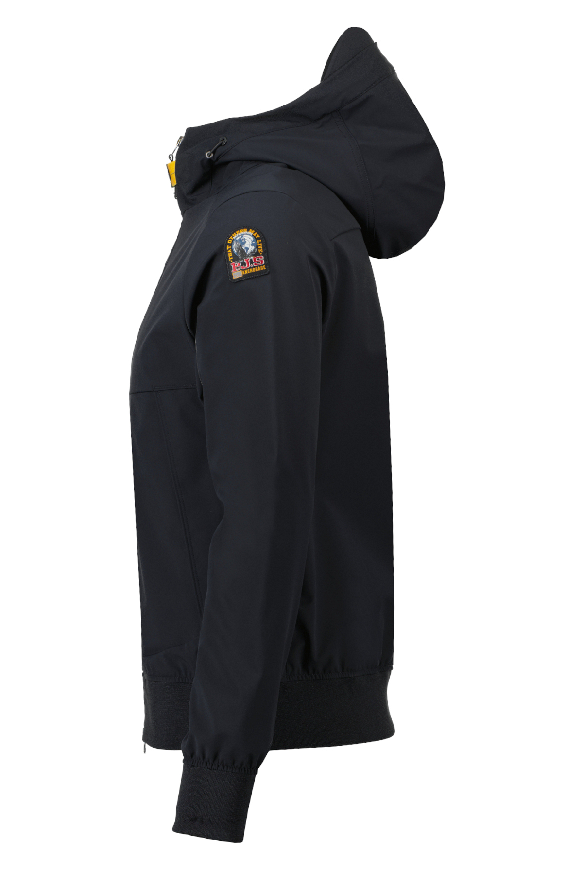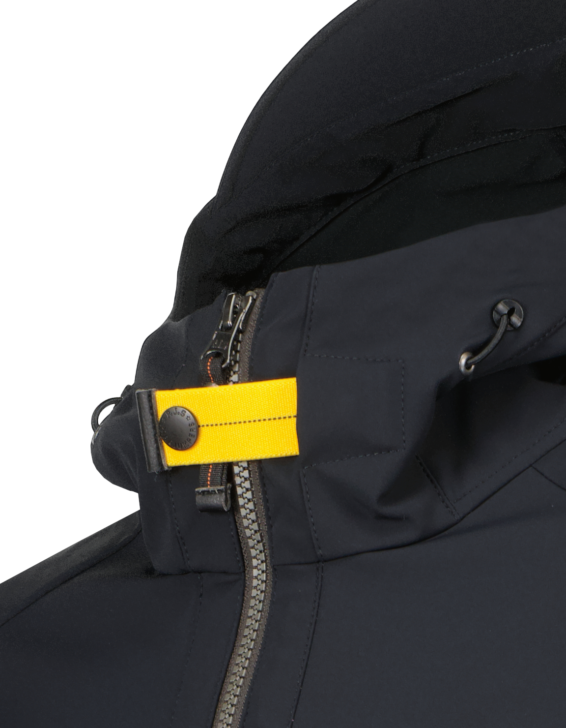 Zwarte jas voor heren model Abner van Parajumpers. De Abner is een windjack met capuchon uit de Shell-serie. Gemaakt van 3-laags stretch soft-shell, biedt de jas bewegingsvrijheid, windbescherming en waterafstotendheid. De jas heeft een sluiting aan de voorkant met dubbele ritssluiting, twee zakken met rits en een binnenzak met klittenband, geribde onderkant en manchetten, een Parajumpers patch op de mouw en een afneembare gele band bij de halsluiting.