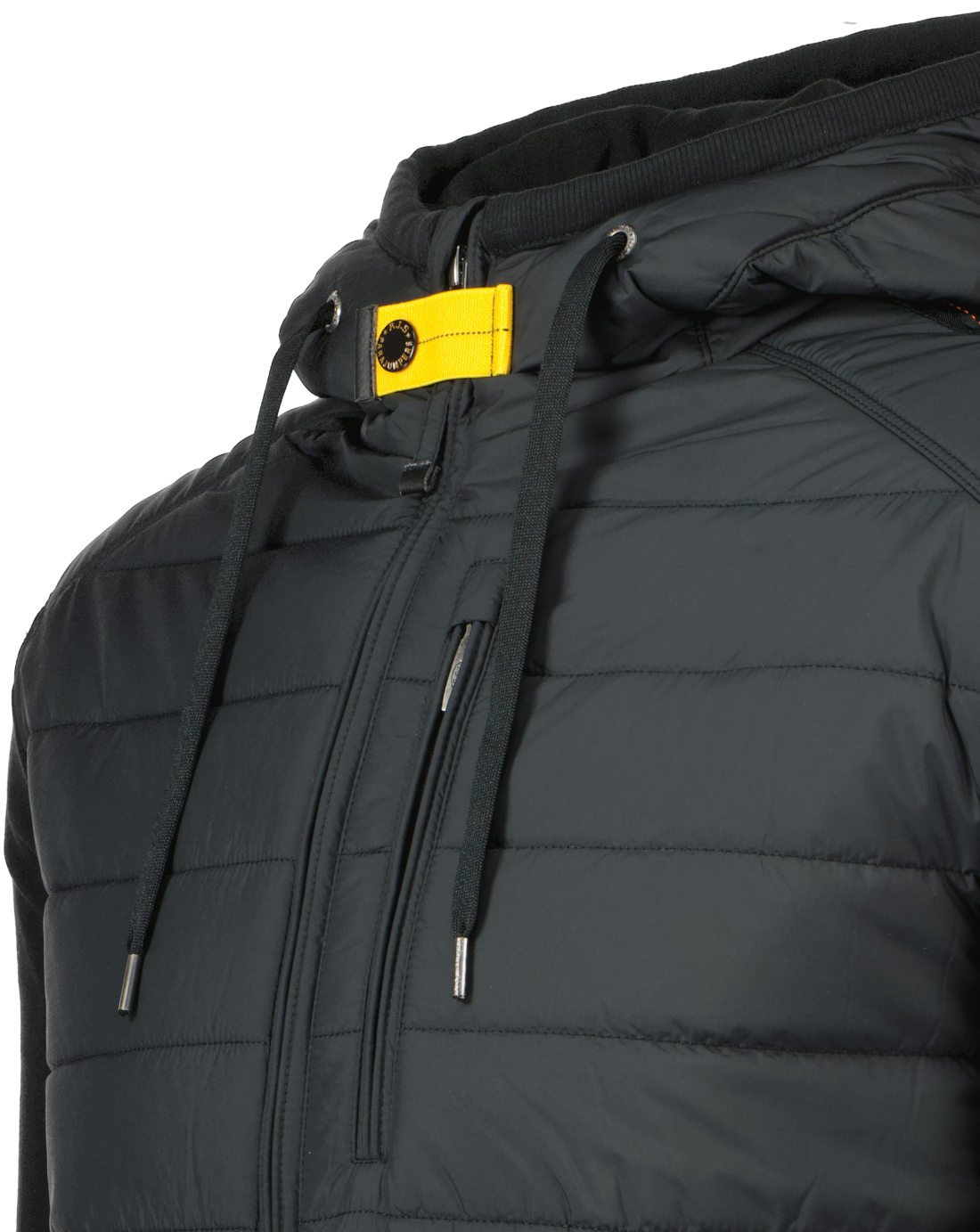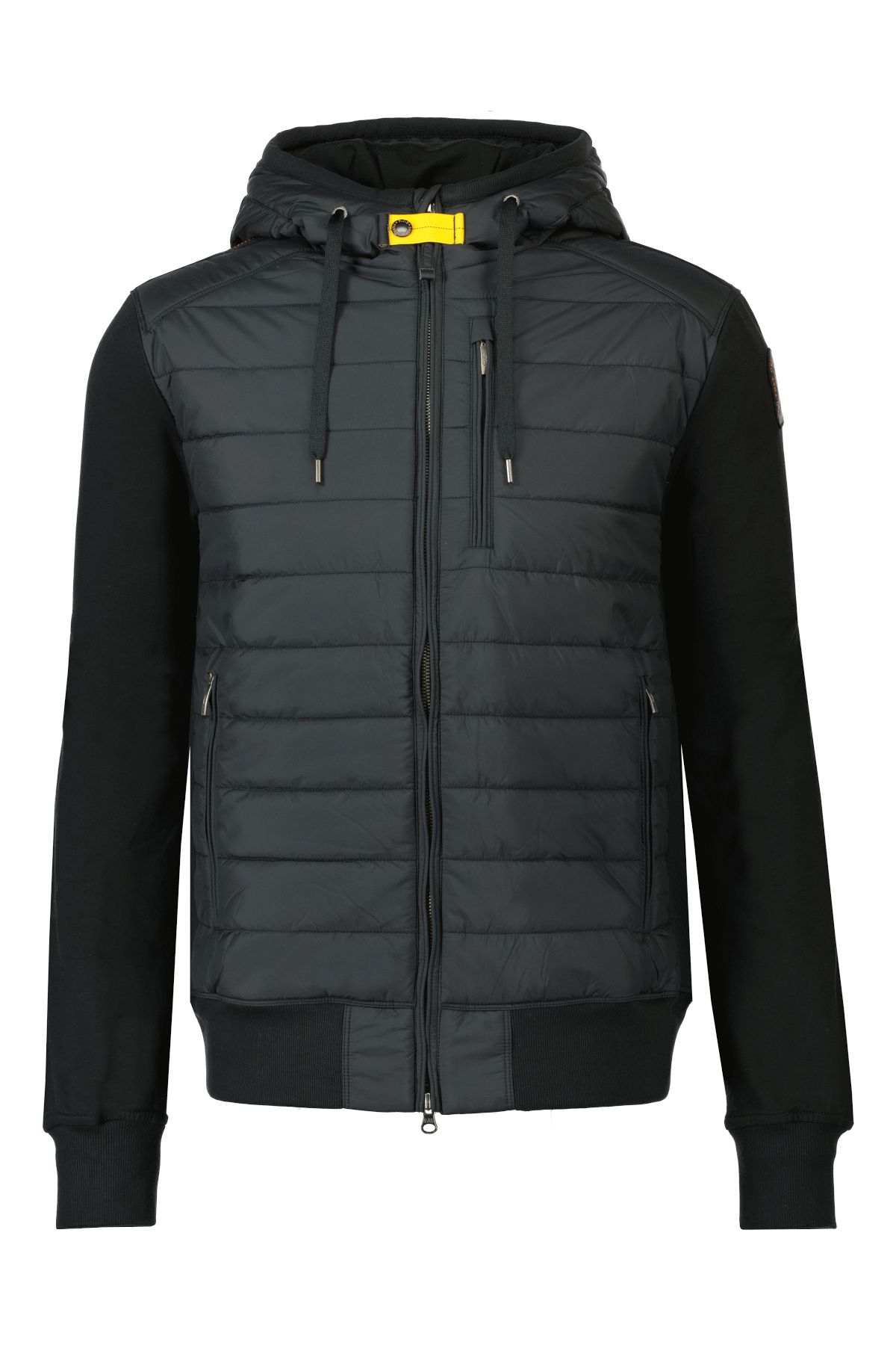 Zwarte jas voor heren model Ivor van Parajumpers. De Ivor is een hybride jas met capuchon, afkomstig uit de Fleece & Puffer-familie en combineert matte polyester tafzijde met stretchkatoen fleece en is gewatteerd met polyester. De jas heeft een verstelbare capuchon met koord, heeft een dubbele ritssluiting, heeft twee ritszakken op de voorkant en twee binnenzakken met klittenband en heeft een Parajumpers-patch op de mouw en sluiting met de bekende gele strook op de hals.