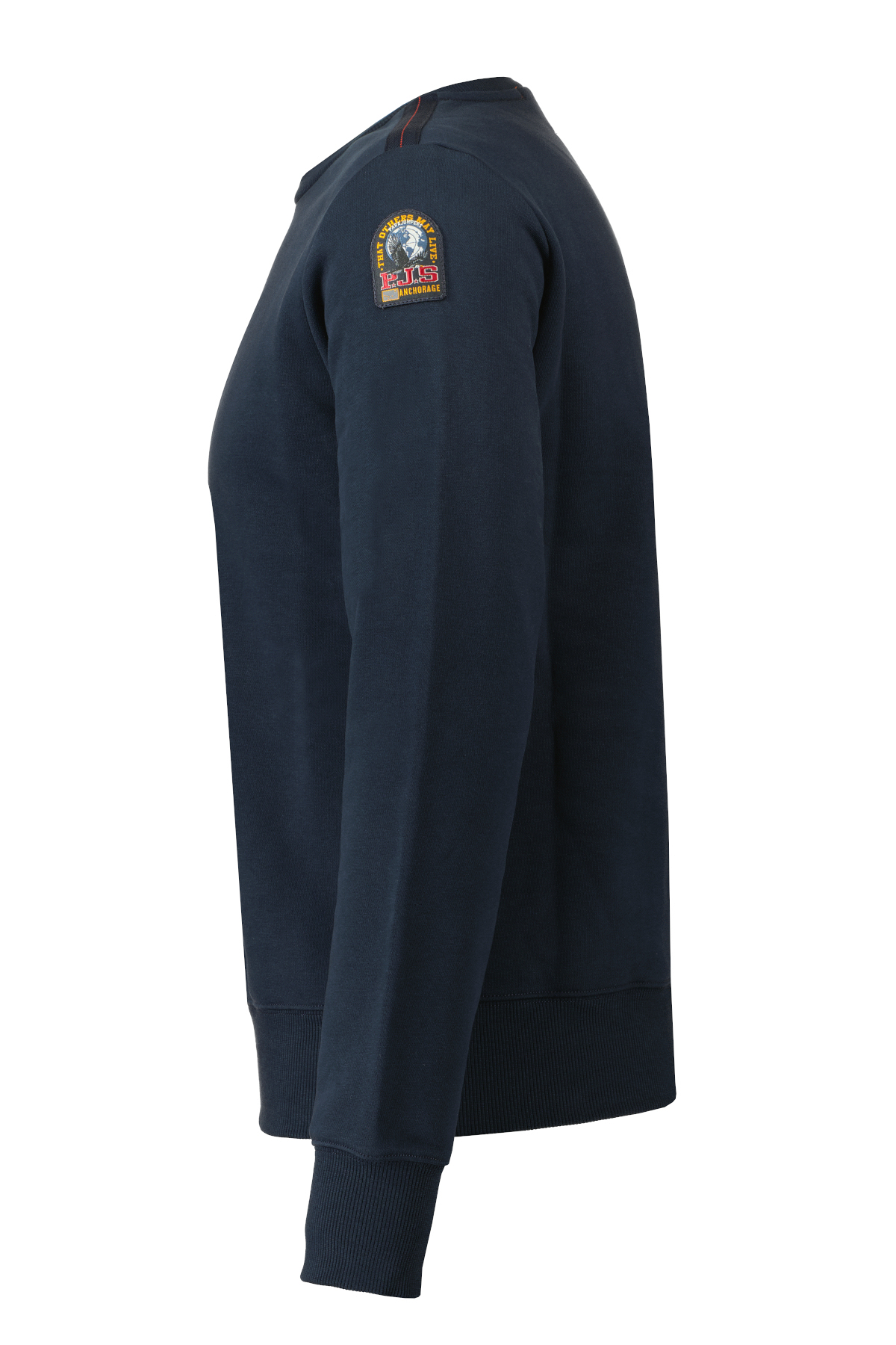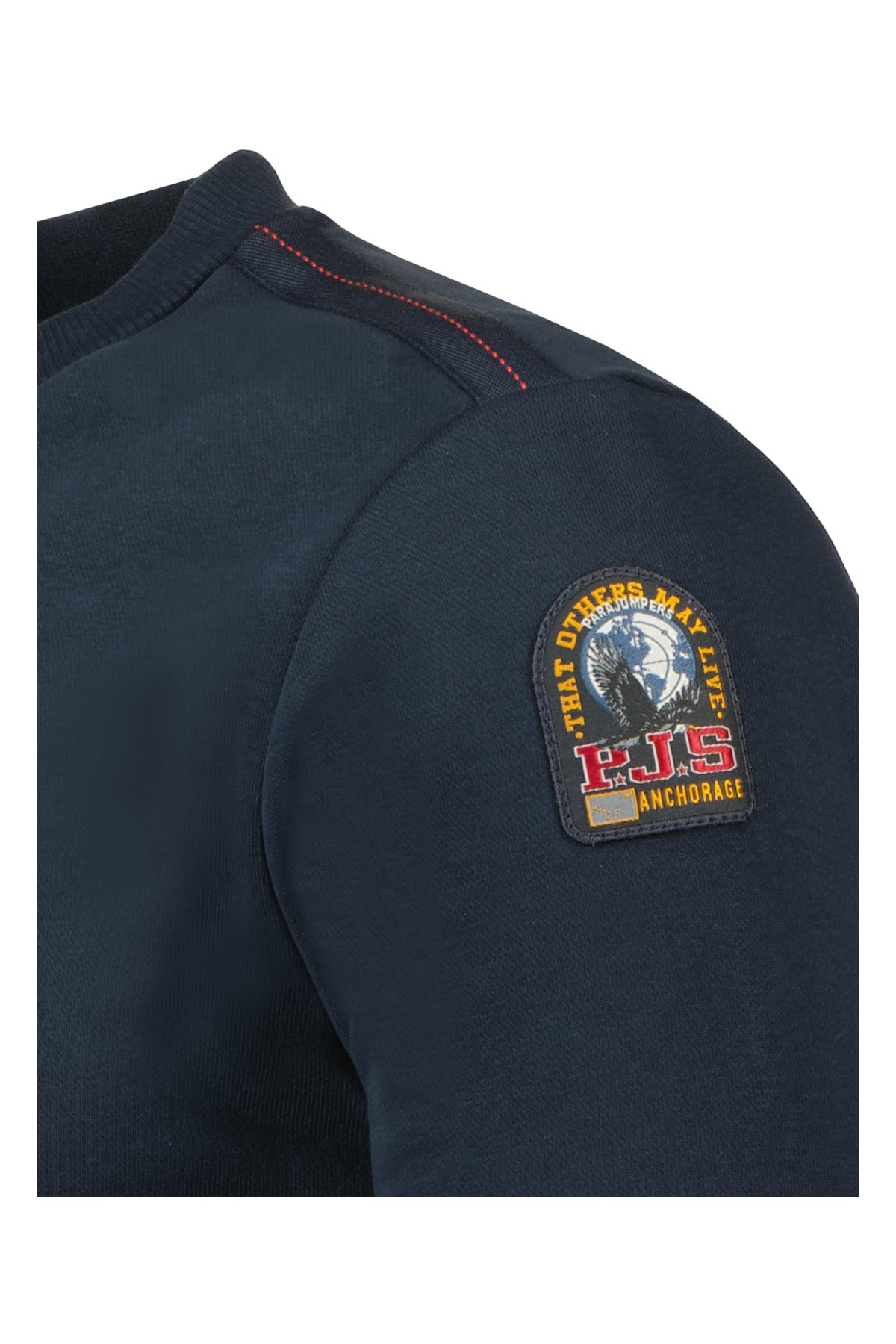 Donkerblauwe sweater model K2 van Parajumpers. Deze sweater heeft een crewneck, rode stiksel-details en een Parajumpers logo op de linkerarm.