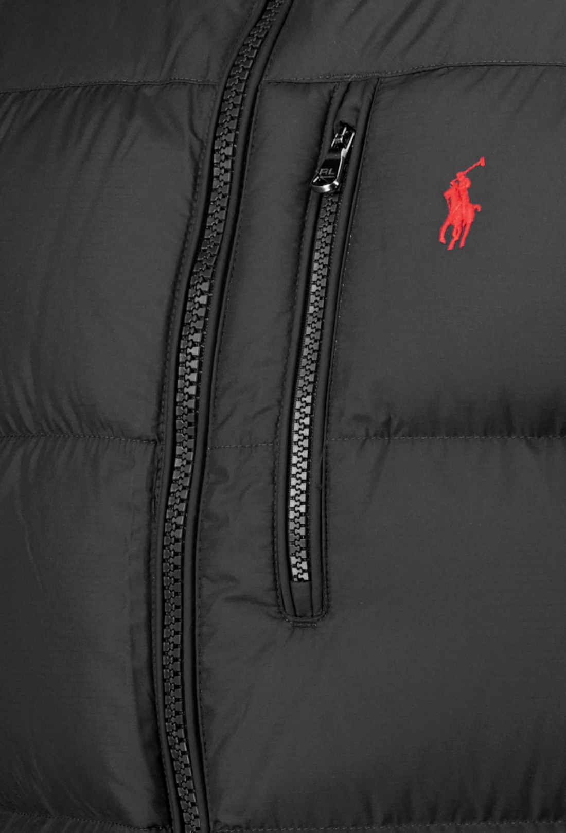 Zwarte bodywarmer voor heren van Ralph Lauren. Deze bodywarmer heeft een mockneck, een tweewegritssluiting aan de voorkant met een flap aan de bovenkant om schuren te voorkomen, een linkerborstzak met ritssluiting, twee zakken met ritssluiting aan de voorkant, een binnenzak op de rechterborst, is volledig gevoerd en gevuld en heeft de kenmerkende geborduurde pony op de linkerborst.