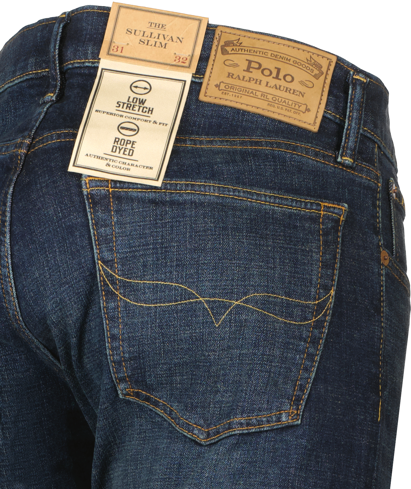 Donkerblauwe jeans voor heren model Sullivan van Ralph Lauren. De Sullivan heeft een smalle pijp, een normale taillehoogte en een nauwsluitende pasvorm rond het zitvlak, de dij en de knie. Deze jeans is gemaakt van Amerikaans katoen en is met de hand geschuurd voor een versleten look.