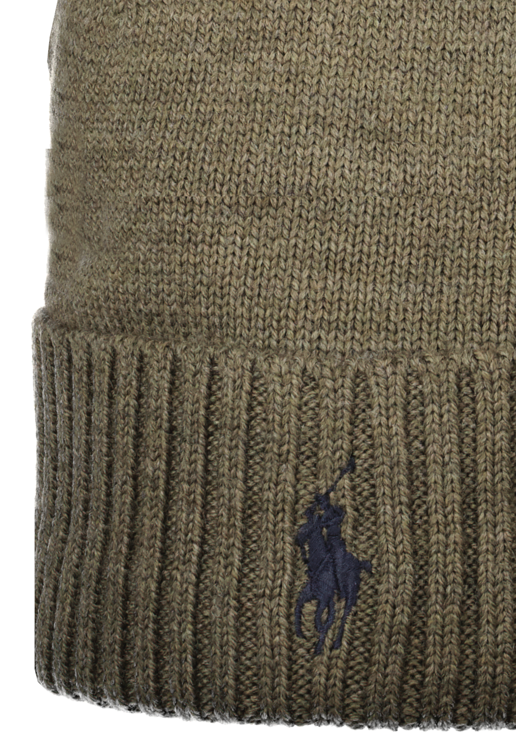 Donkergroene gebreide muts van Ralph Lauren. De muts is gemaakt met garens van kamgaren die speciaal zijn behandeld voor gemakkelijk onderhoud en tegelijkertijd duurzaamheid en zachtheid behouden. De muts is afgewerkt met de kenmerkende geborduurde Pony van Ralph Lauren.