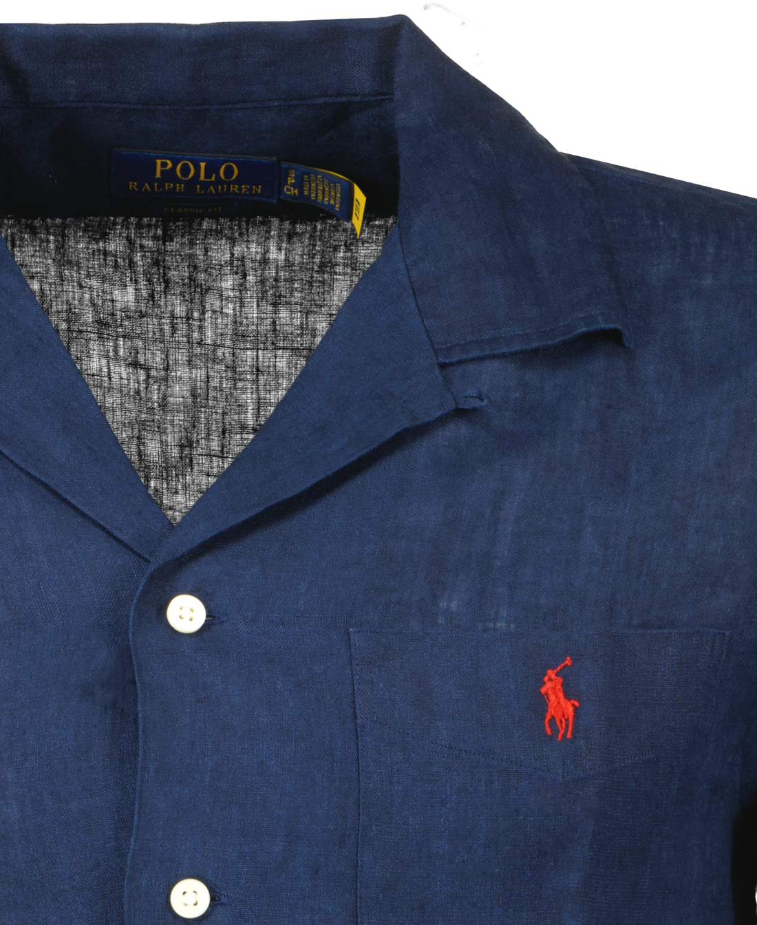 Donkerblauw linnen overhemd met korte mouwen van Ralph Lauren. Dit overhemd heeft een cubaanse kraag, knoopsluiting, korte mouwen, een opgenaaide zak op de linkerborst, de geplooide rugpas zorgt voor gladde, voorgevormde schouders, heeft de kenmerkende geborduurde pony op de zak en valt classic fit: ruimer gesneden bij de borst, taille en mouw met een lager armsgat.