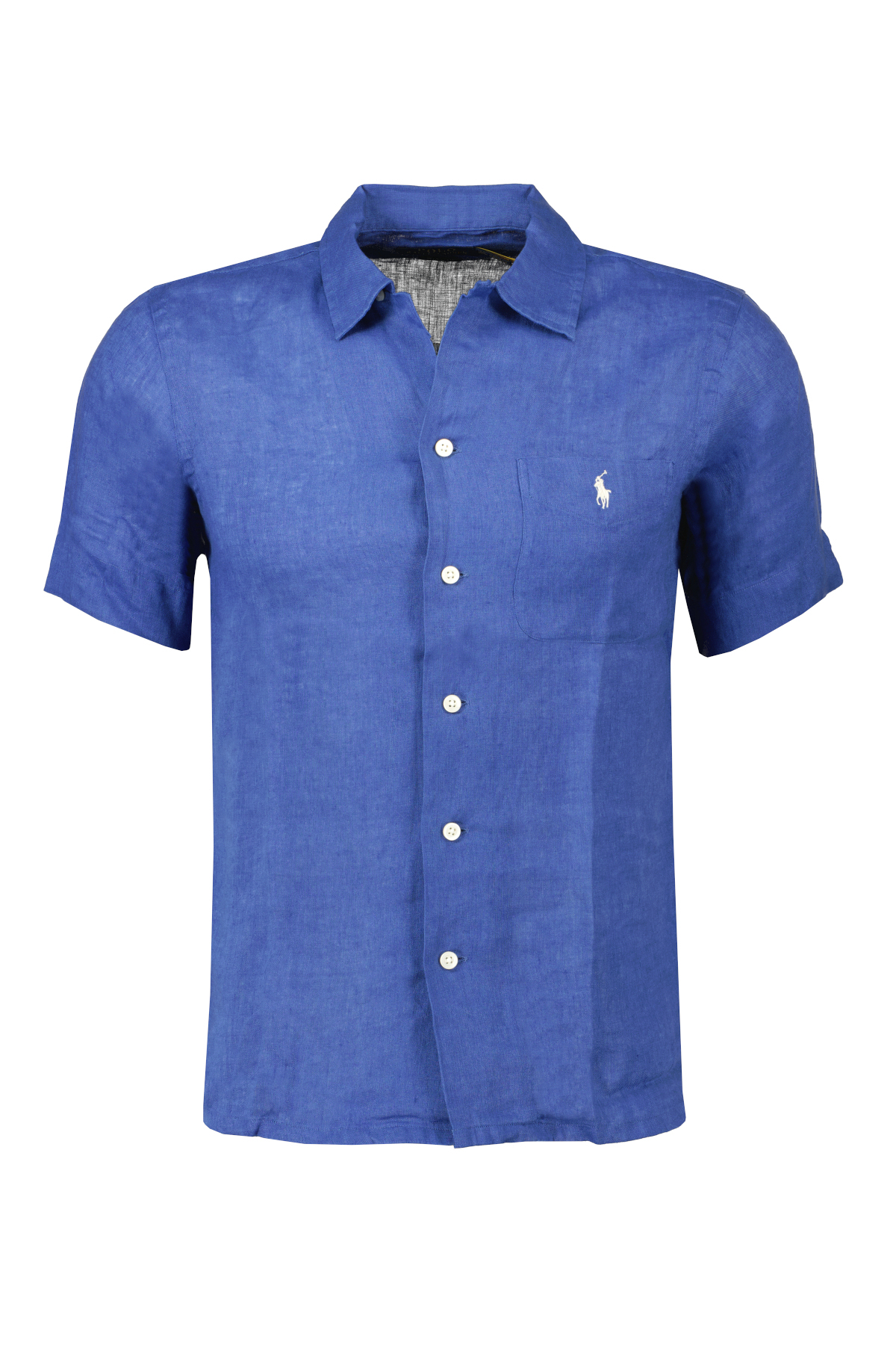 Blauw linnen overhemd voor heren van Ralph Lauren. Dit overhemd heeft een cubaanse kraag, knoopsluiting, korte mouwen, een opgenaaide zak op de linkerborst, de geplooide rugpas zorgt voor gladde, voorgevormde schouders, heeft de kenmerkende geborduurde pony op de zak en valt classic fit: ruimer gesneden bij de borst, taille en mouw met een lager armsgat.