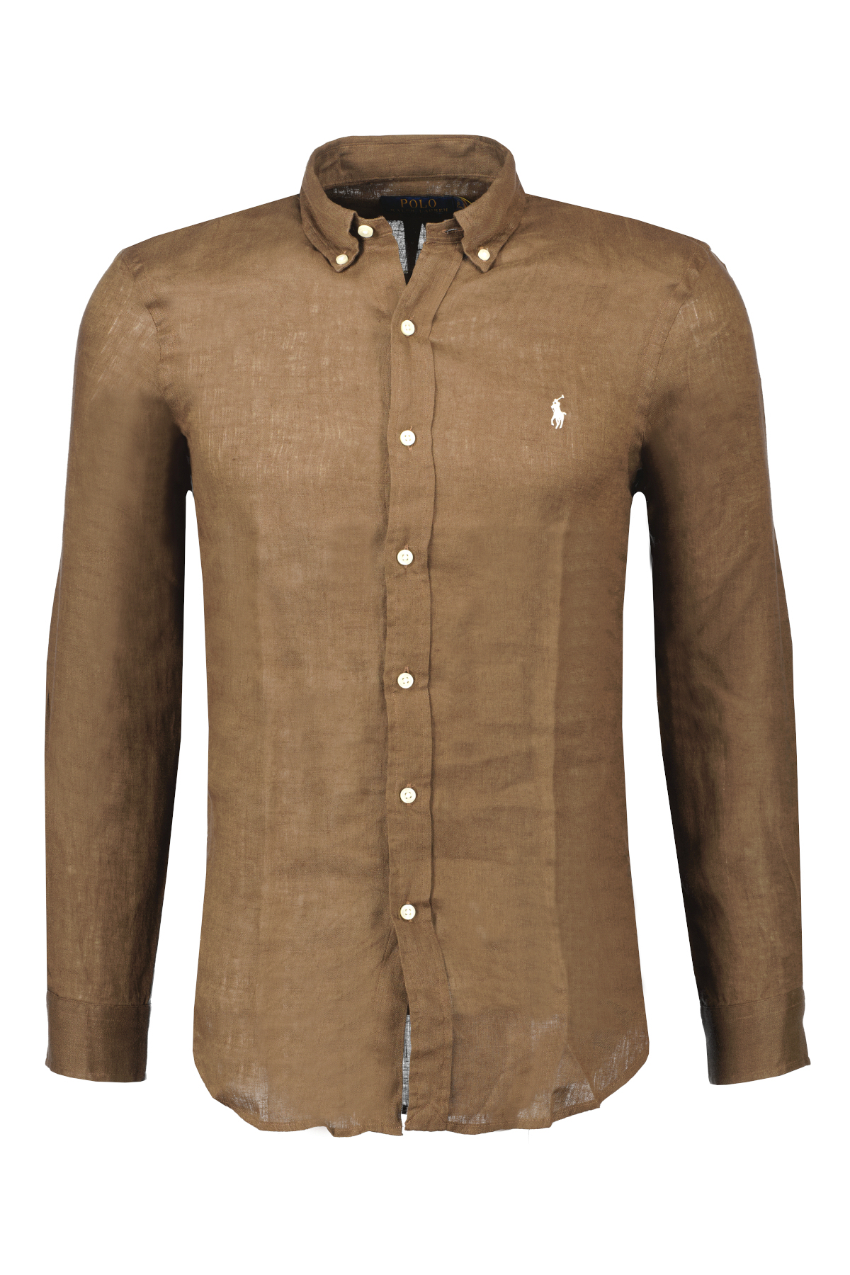 Bruin overhemd voor heren van Ralph Lauren. Geïnspireerd door twee van de iconen uit de Ralph Lauren Polo collectie, combineert deze button-down kraag de look van een Oxford-overhemd met het comfort en gemak van de 100% linnen stof. Lange mouwen met manchetten met knopen. Het gespleten rugpand met stolpplooi zorgt voor een comfortabele pasvorm en meer bewegingsvrijheid. De kenmerkende geborduurde pony op de linkerborst.