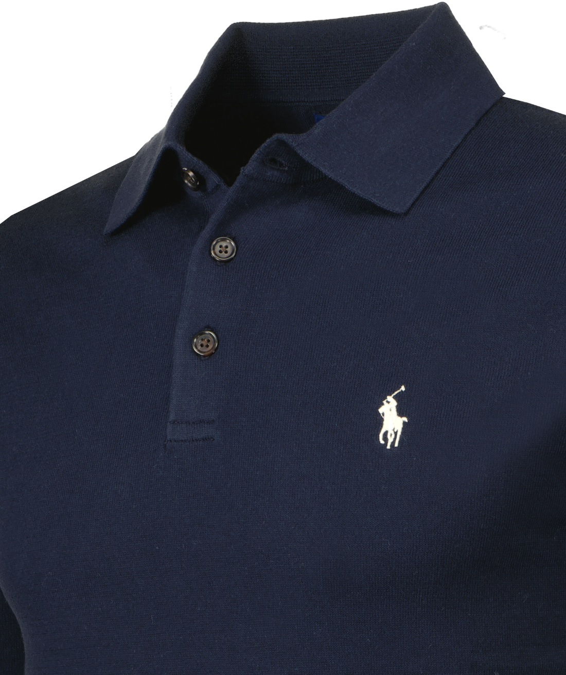 Donkerblauwe gebreide polo voor heren van Ralph Lauren. Deze polo heeft korte mouwen, een standaard polokraag met twee knoopsluitingen, heeft een wit logo op de linkerborst en valt regular: breder bij de borst, maar toch een modern silhouet behoudend.