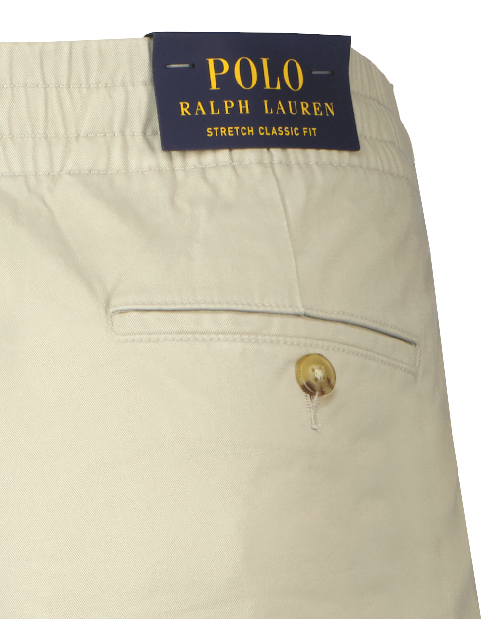 Beige grijze korte broek model Polo Prepster stretch chino voor heren van Ralph Lauren. De short sluit met knoop en trekkoord in de kleur wit. De short heeft twee steekzakken aan de voorzijde, achterzijde is voorzien van twee kleine zakken die sluiten met knoop. Het logo staat onderaan de short in het beige geborduurd.