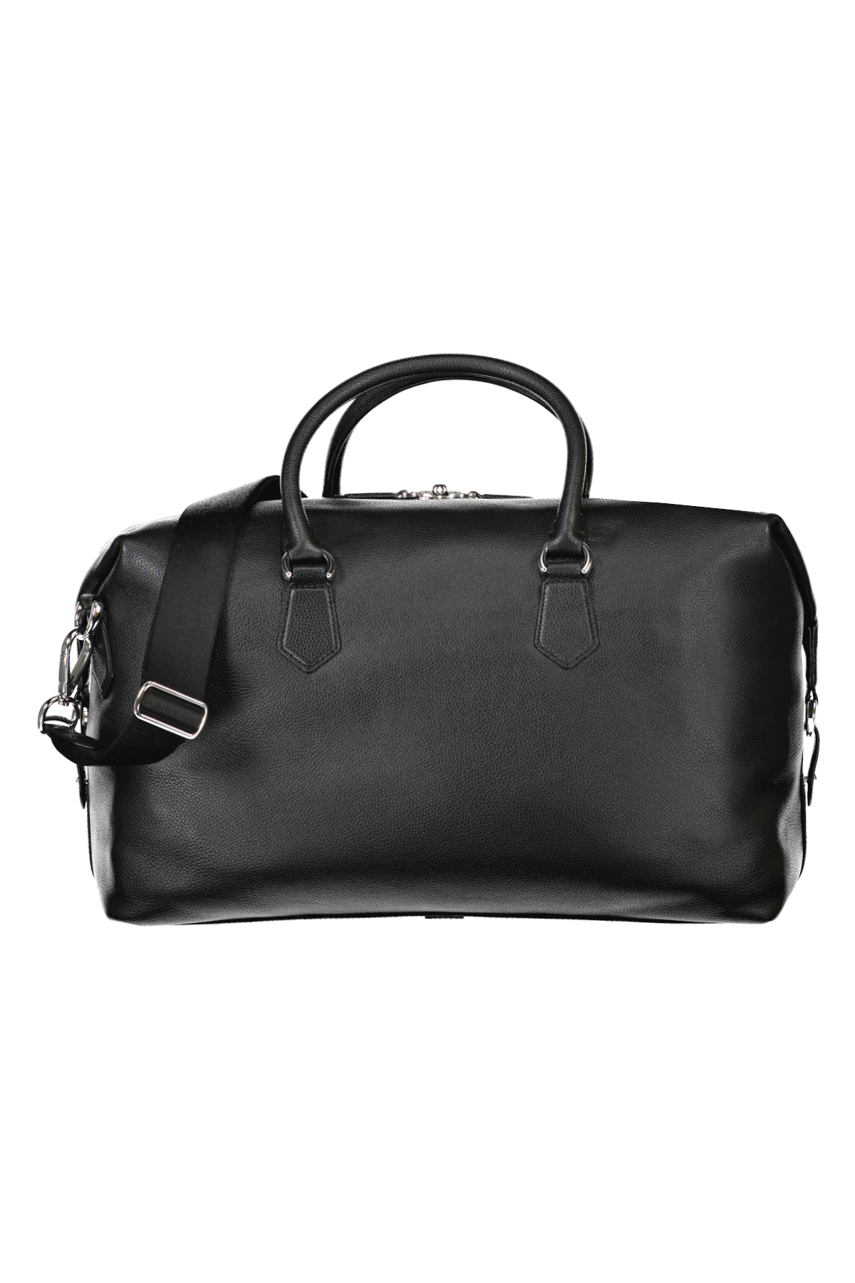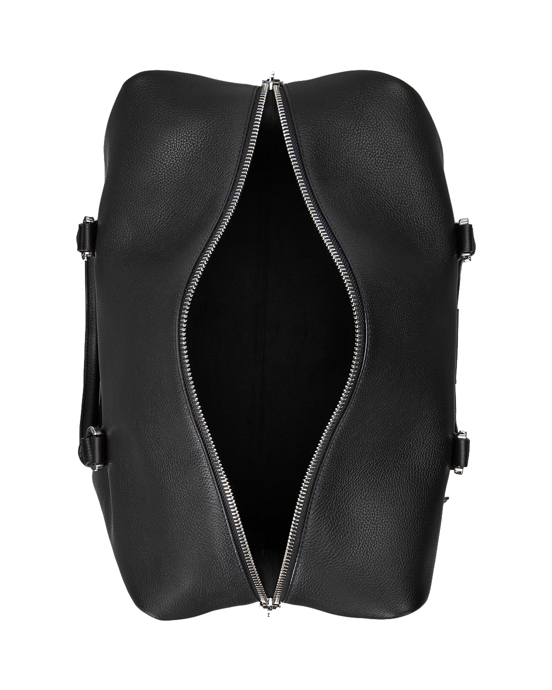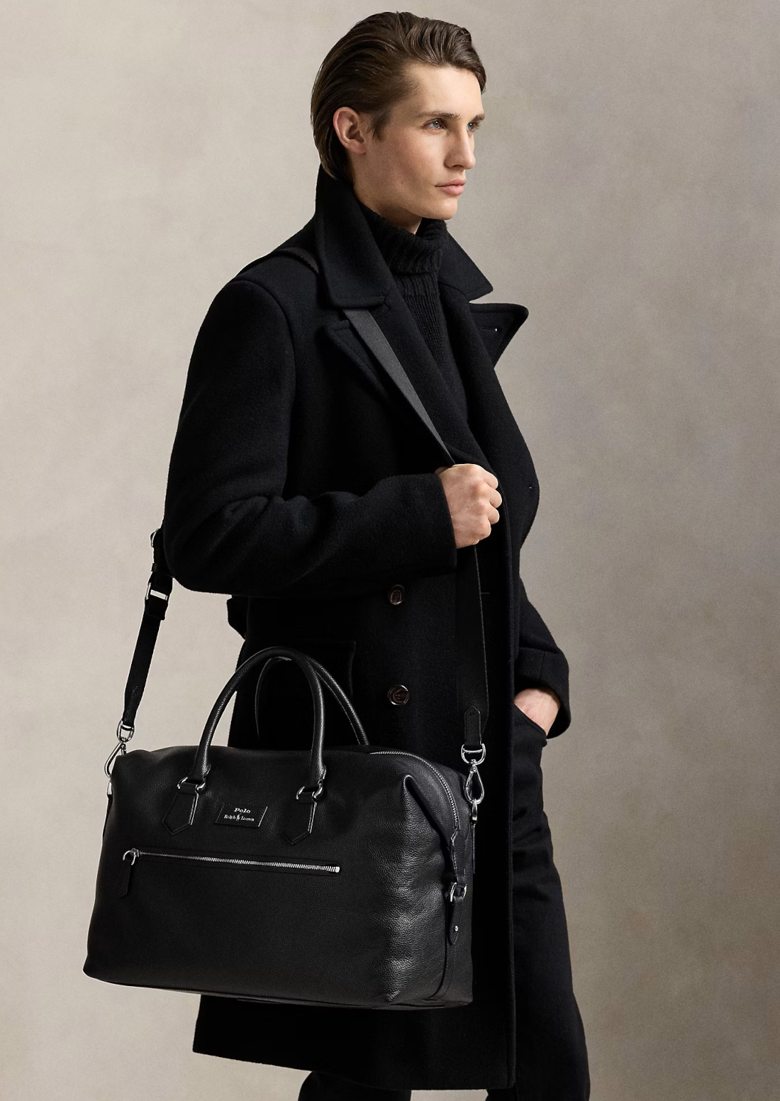 Zwarte leren tas voor heren van Ralph Lauren. Deze plunjezak van gekorreld leer is ontworpen met meerdere compartimenten en zakken om spullen georganiseerd te houden. Het gestroomlijnde silhouet is afgewerkt met kenmerkende gegraveerde hardware. De tas heeft twee leren handvatten, een afneembare en verstelbare schouderriem, een tweewegritssluiting aan de bovenkant met leren ritstrekkers, een ritsvak aan de voorkant, een schoenenvak met rits aan de zijkant en een binnenvak met rits.
