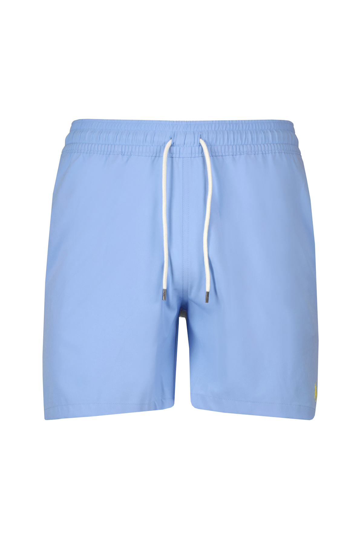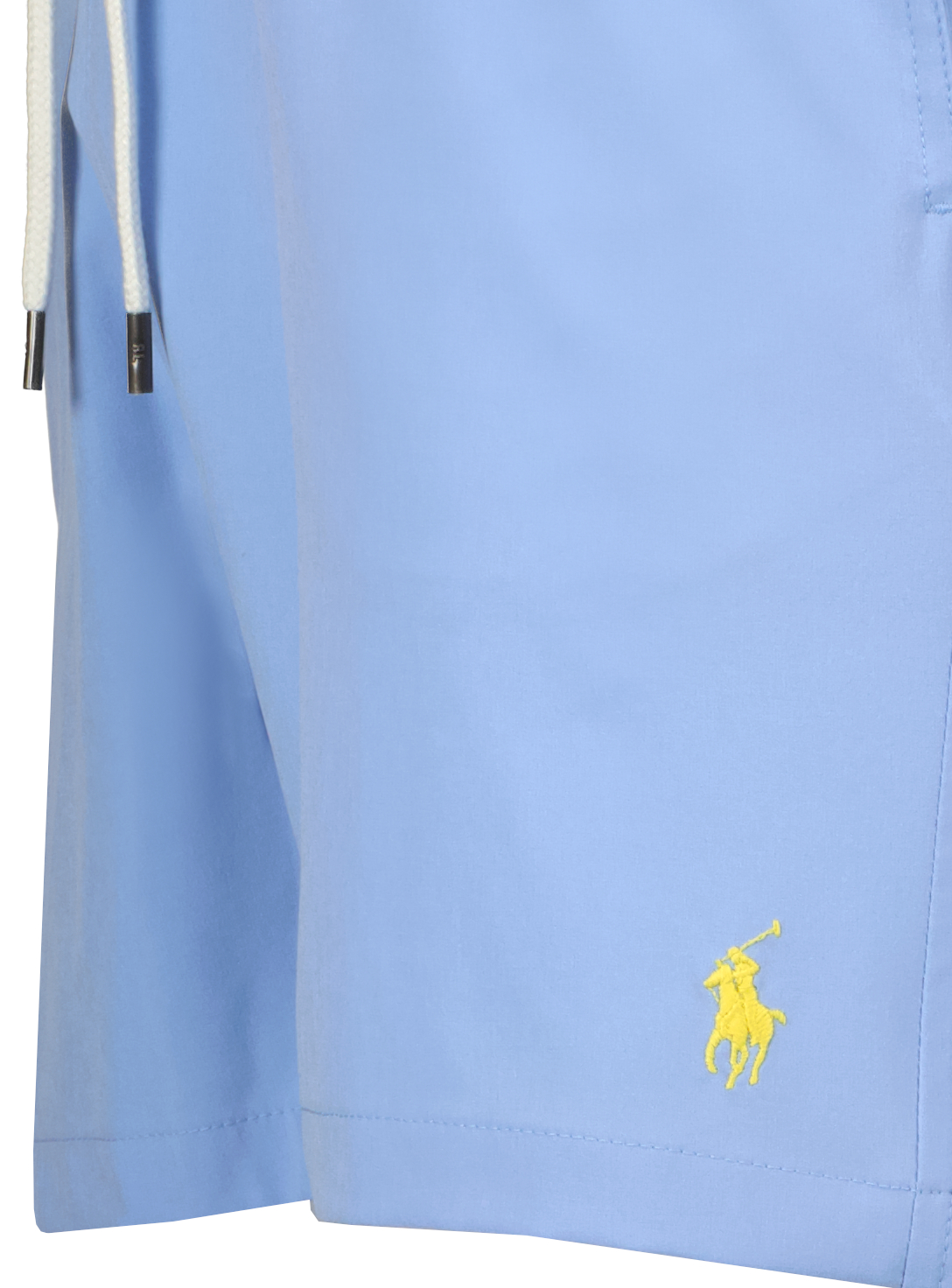 Lichtblauwe zwemshort voor heren van Ralph Lauren. Dit model heeft een elastische tailleband met trekkoord, zakken in de zijnaden, een achterzak met knoop en Swimwear label, mesh binnenbroek voor extra ondersteuning en de pony geborduurd op de linkerzoom.