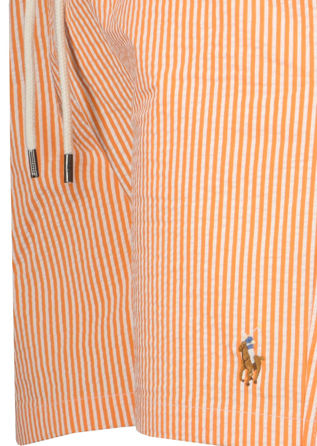Oranje met wit gestreepte zwemshort voor heren van Ralph Lauren. Dit model is gemaakt van seersucker stof met stretch, heeft een elastische tailleband met trekkoord, zakken in de zijnaden, een achterzak met knoop en Swimwear label, mesh binnenbroek voor extra ondersteuning en de pony geborduurd op de linkerzoom.