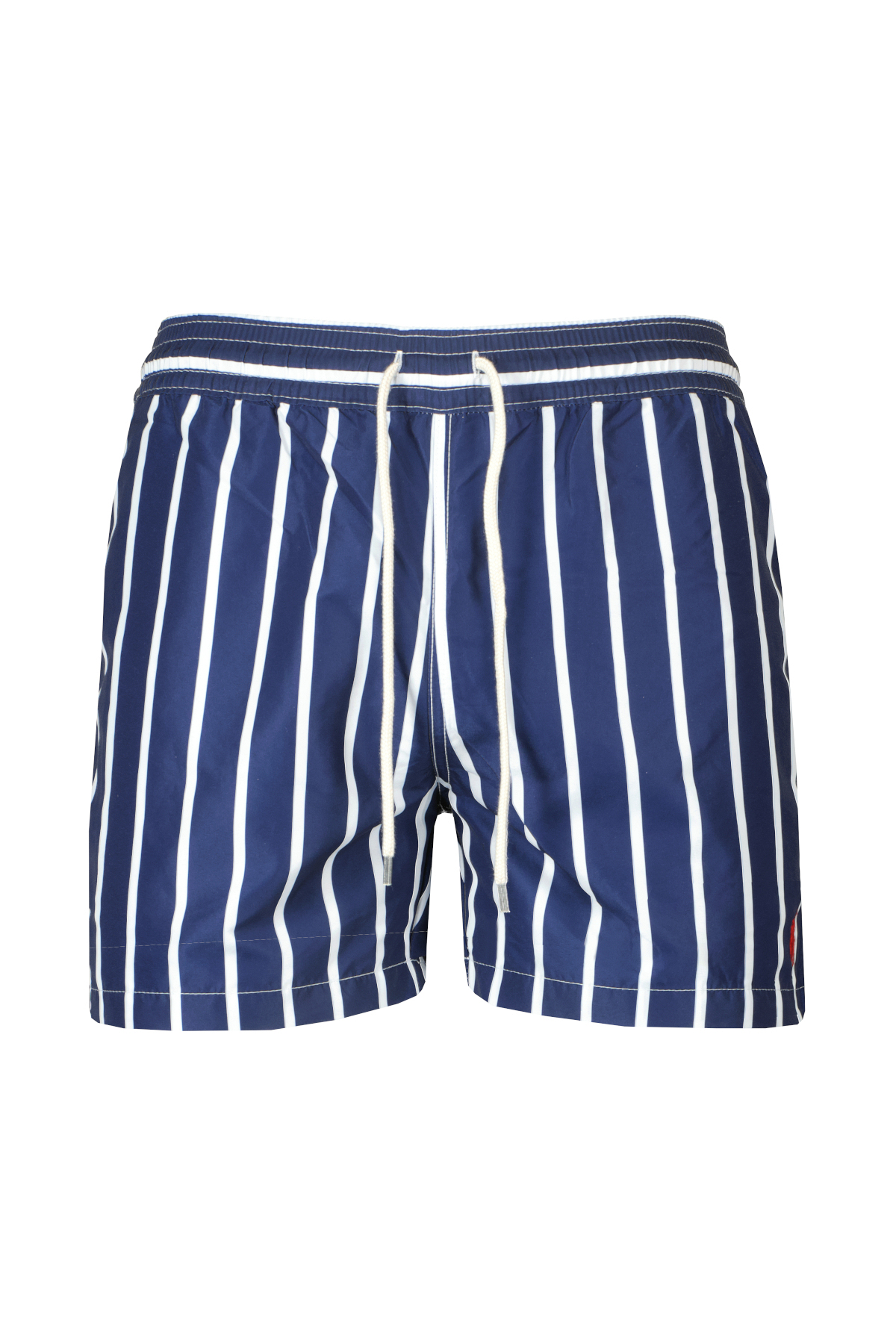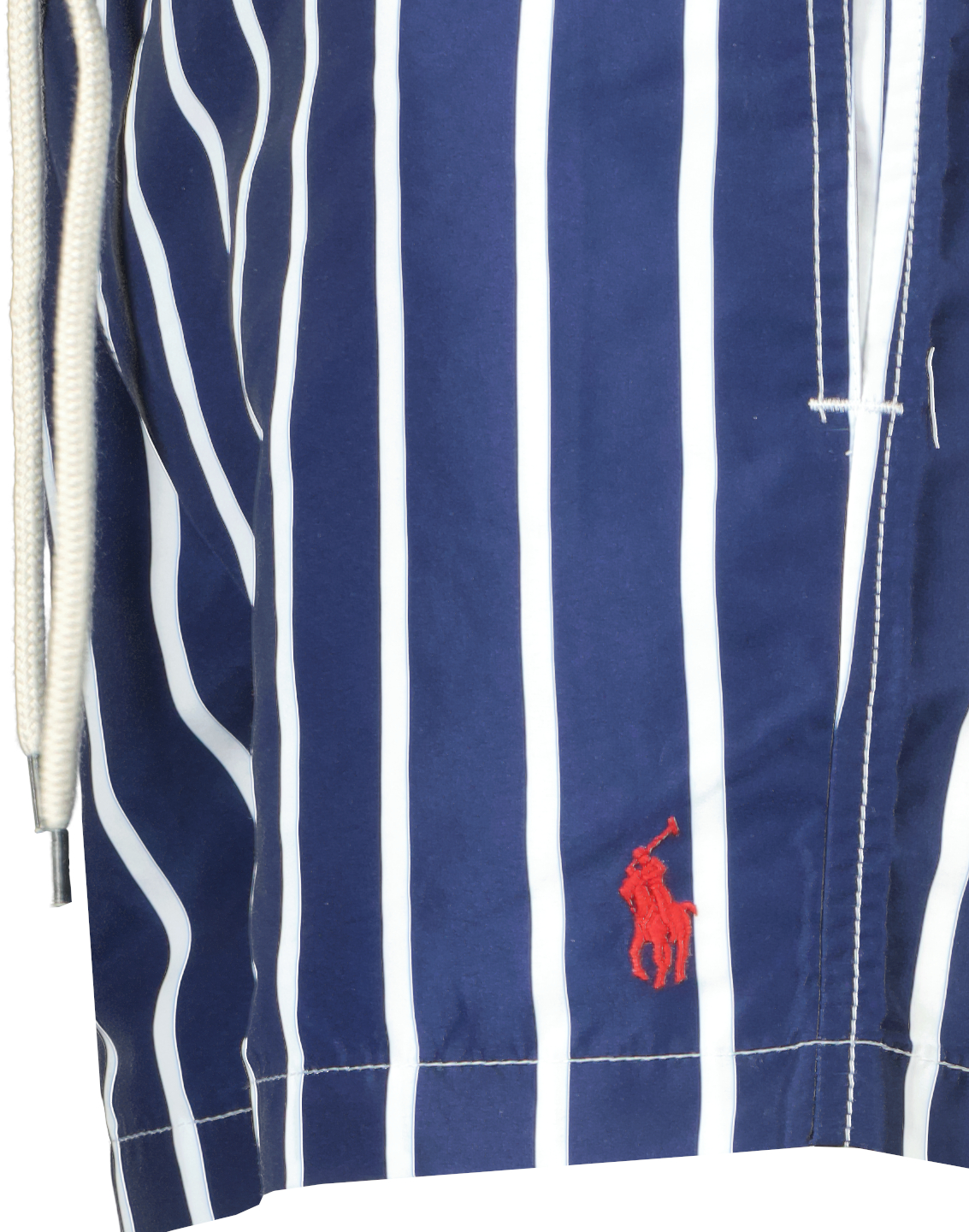 Donkerblauw gestreepte zwemshort voor heren van Ralph Lauren. Dit zwemshort heeft twee steekzakken, een enkele achterzak met knoopsluiting en logo, een elastische tailleband met trektouwtjes en het geborduurde pony logo op de linkerbeen.