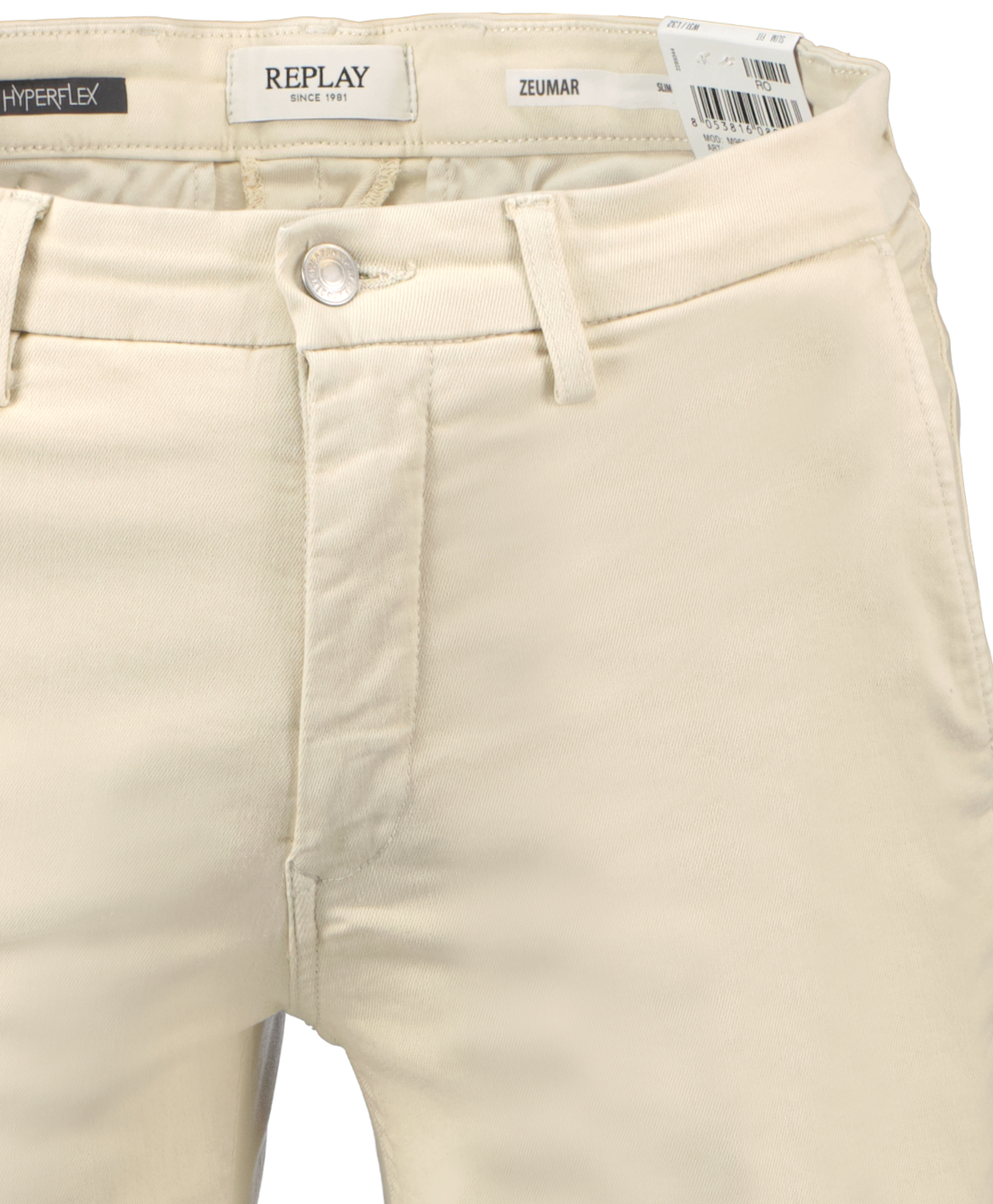 Lichtbeige chinojeans voor heren model Zeumar van Replay. De Zeumar is gemaakt van Reform Hyperflex stretch katoenmix denim, is oudgekleurd geverfd en stonewashed en heeft normale taille en smalle pijpen. Met twee zakken aan de voorkant en twee zakken met knopen aan de achterkant, wordt het item geaccentueerd door het custom label aan de achterkant van de tailleband. De broek is voorzien van een ritssluiting en knoopsluiting.