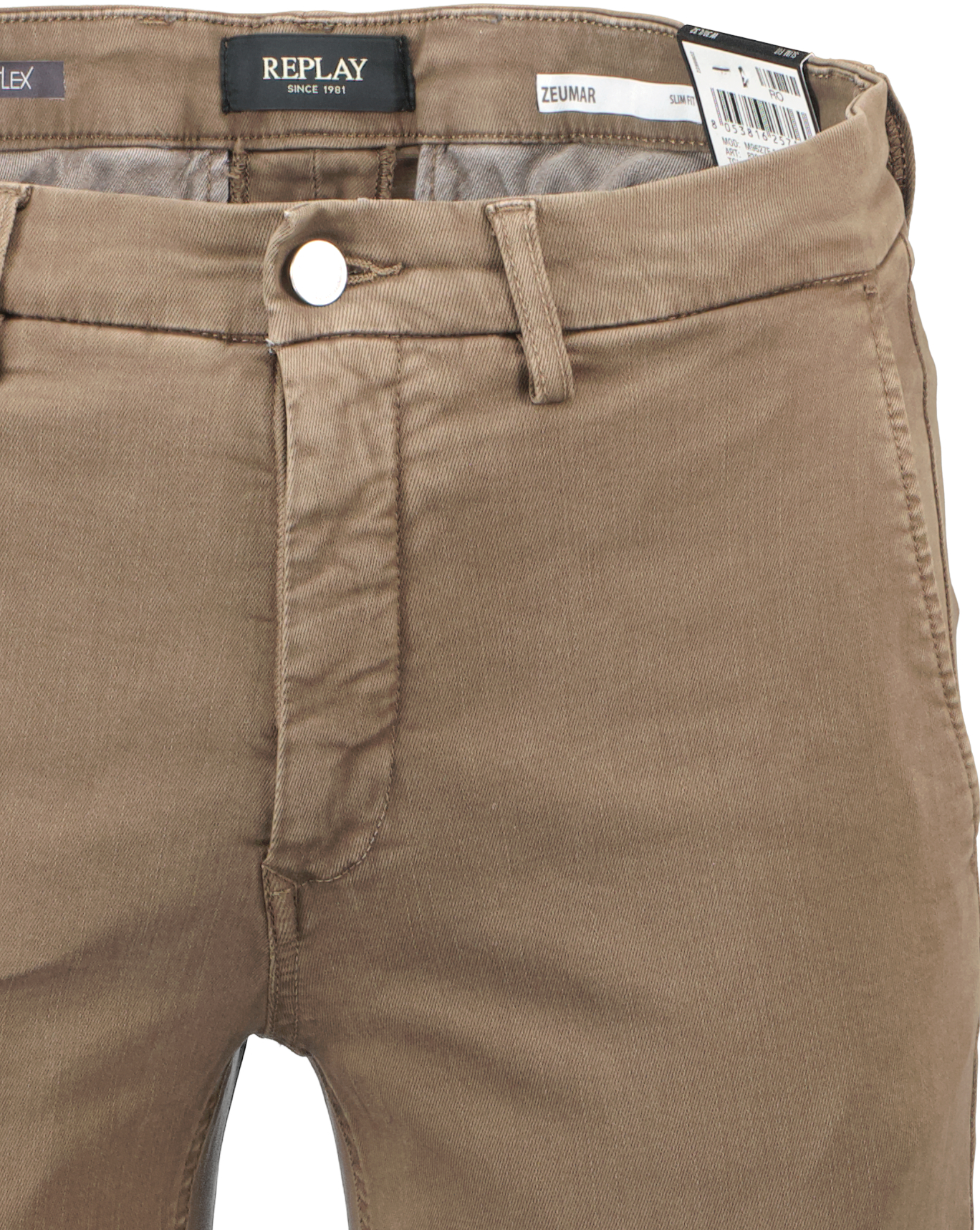Bruine chinojeans voor heren model Zeumar van Replay. De Zeumar is gemaakt van Reform Hyperflex stretch katoenmix denim, is oudgekleurd geverfd en stonewashed en heeft normale taille en smalle pijpen. Met twee zakken aan de voorkant en twee zakken met knopen aan de achterkant, wordt het item geaccentueerd door het custom label aan de achterkant van de tailleband. De broek is voorzien van een ritssluiting en knoopsluiting.