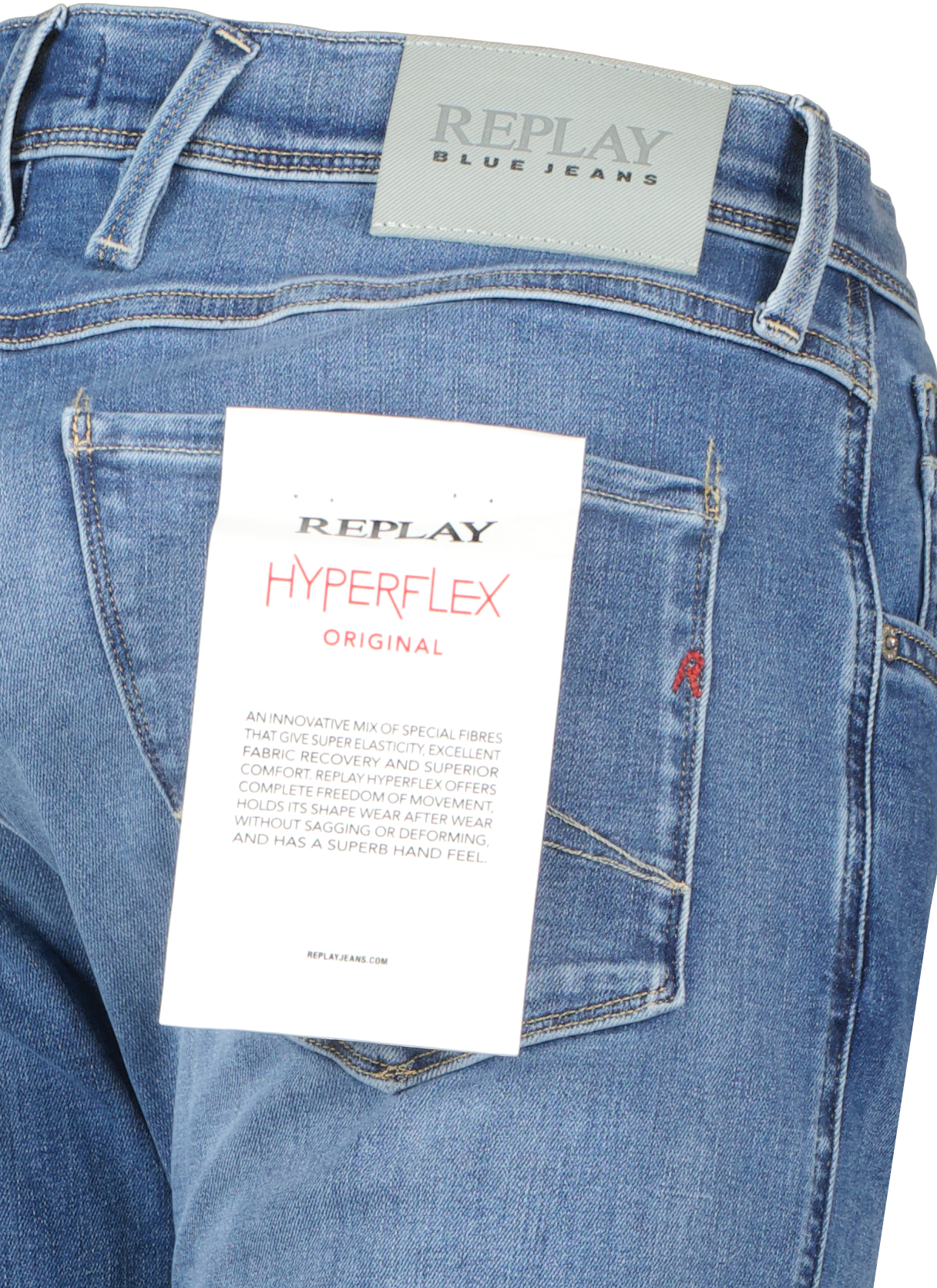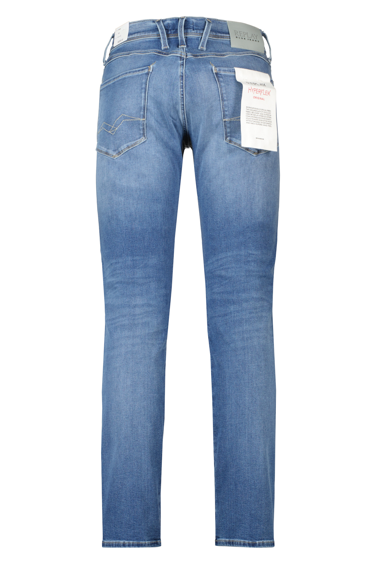 Blauwe jeans voor heren model Anbass van Replay. De broek is gemaakt van 'Hyperflex Reform' stretchdenim met een lichtere wassing. De broek heeft vijf zakken en wordt gekenmerkt door de schraapsels die contrasterende kleuren creëren op gebruikte delen. Heeft een rits- en knoopsluiting. De stof is gemaakt van biologisch of gerecyclede materialen.