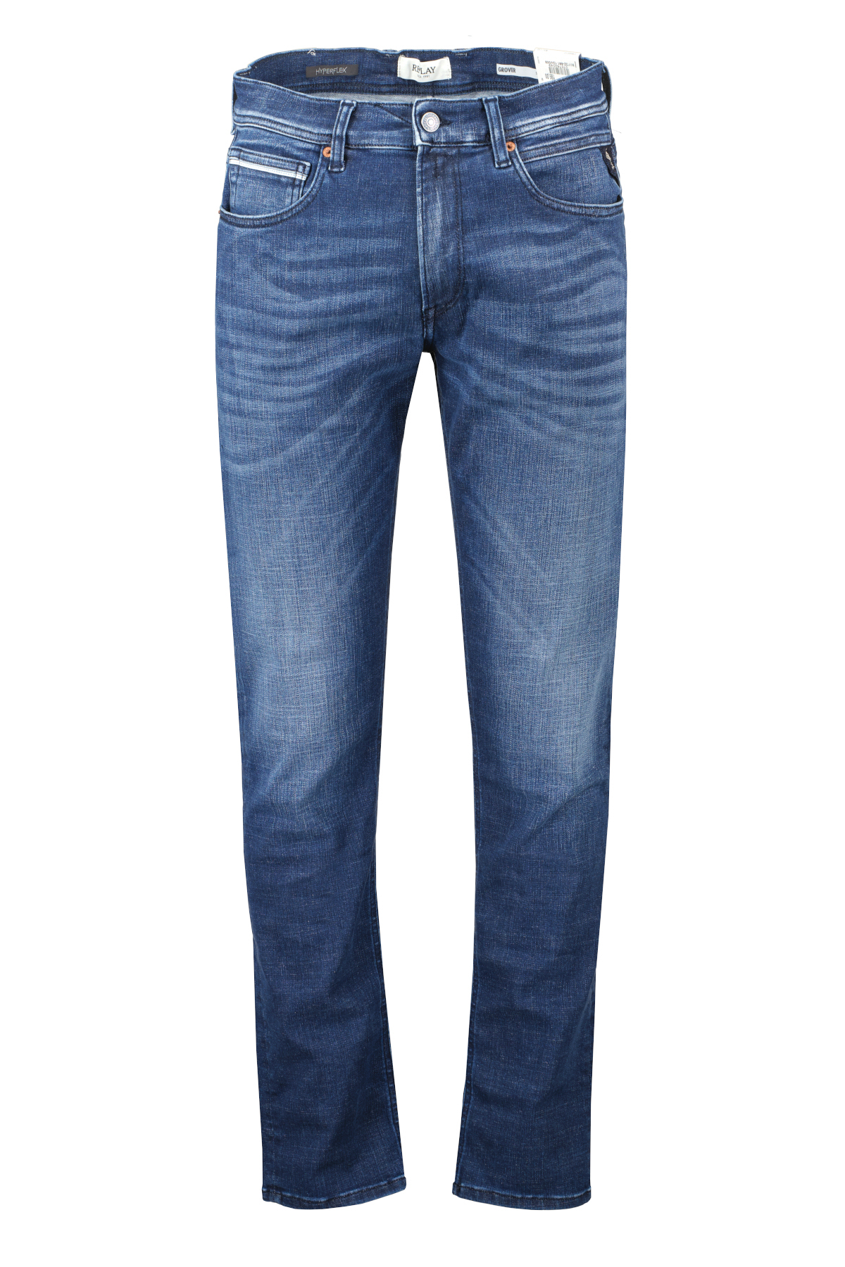 Blauwe jeans voor heren model Grover van Replay. Deze straight-fit jeans met een normale taillehoogte en rechte pijpen van heup tot zoom heeft vijf zakken en is gemaakt van superstretch indigo denim van biologisch katoen met een eco stone wash met synthetische puimsteen. De achterzakken zijn voorzien van gull-wing stiksels en één zak is voorzien van een R-borduursel, terwijl één van de voorzakken een klein merkinzetstuk heeft.