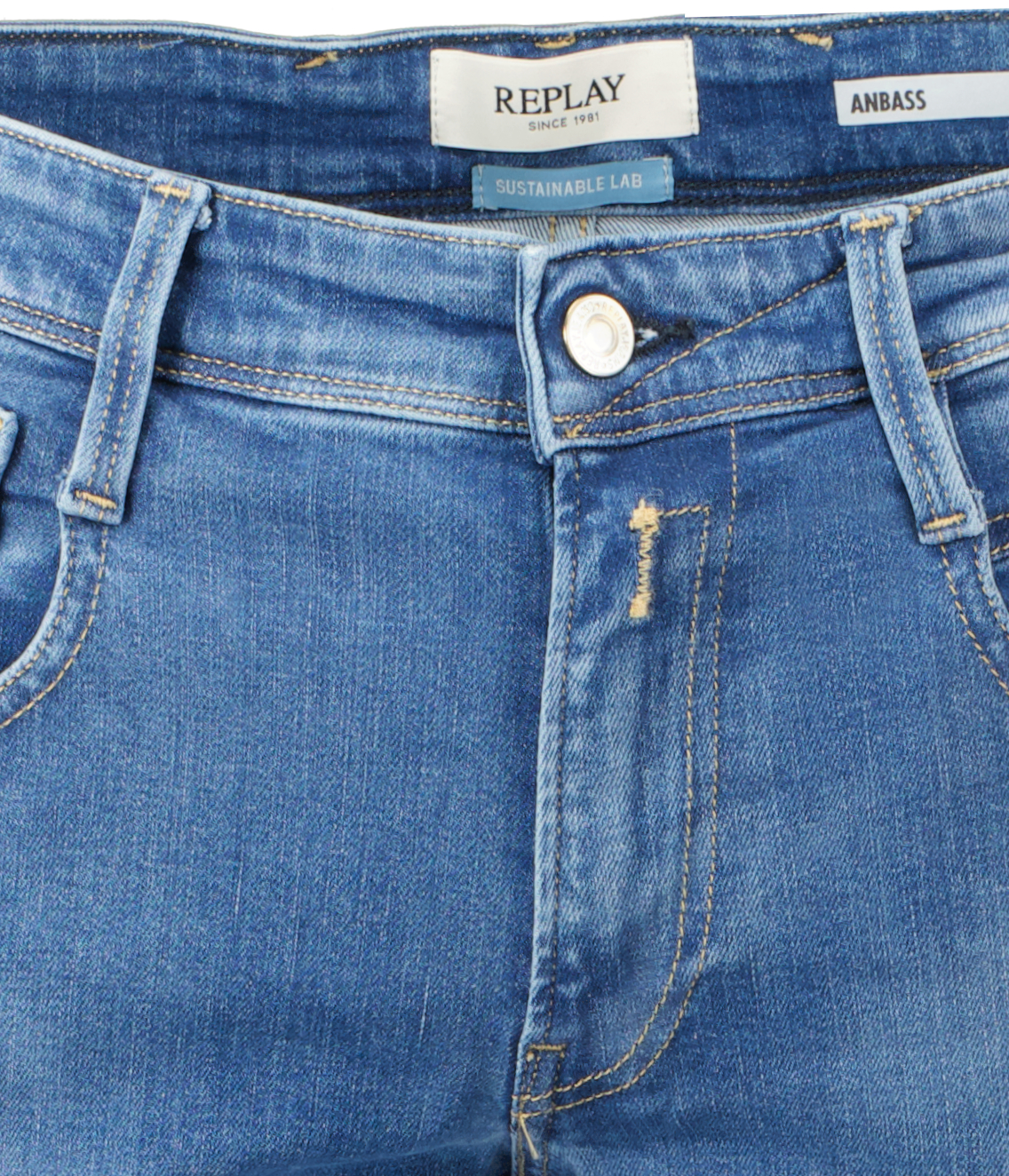 Blauwe jeans voor heren model Anbass van Replay. Deze slim-fit jeans heeft een normale taillehoogte en een smalle pijp die taps toeloopt naar de zoom, heeft vijf zakken is gemaakt van superstretch indigoblauw biologisch katoen met een eco stone wash. Het muntzakje en de achterzakken zijn voorzien van gull-wing stiksel, waarvan één is voorzien van een R-borduursel, terwijl één van de voorzakken een klein merkinzetstuk heeft.