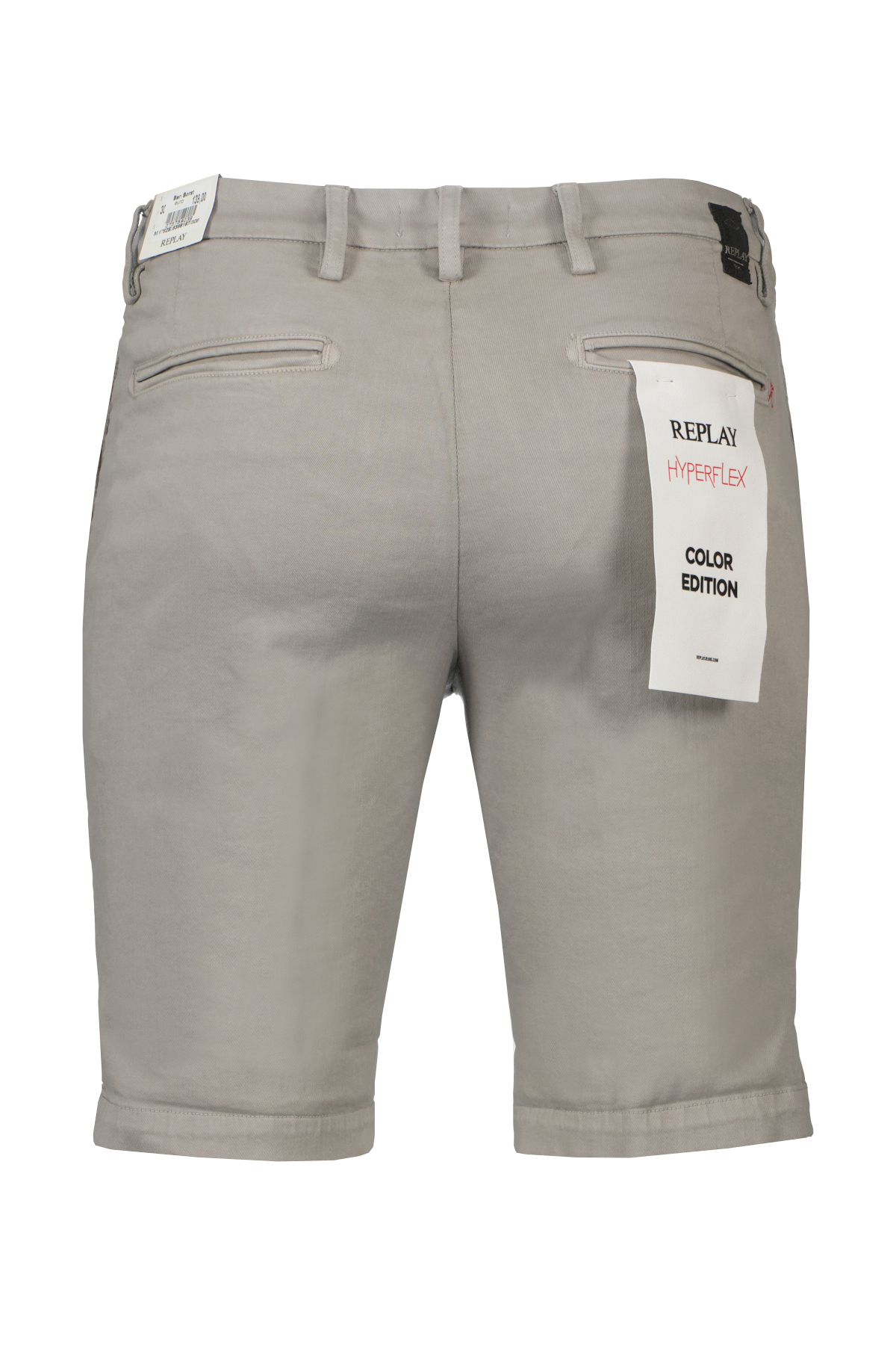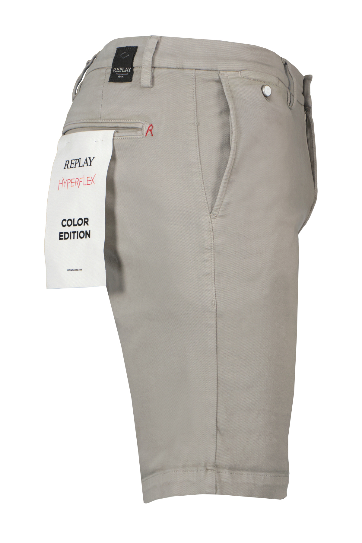 Grijze short model Benni van Replay. Chinoshort met normale pasvorm, normale taille en pijp voor een skinny pasvorm. Het kledingstuk is gemaakt van kledinggeverfd, extra licht, Hyperflex stretchkatoendenim geschikt voor alle seizoenen met stone wash. De broek heeft paspelzakken en een ritssluiting en knoopsluiting.