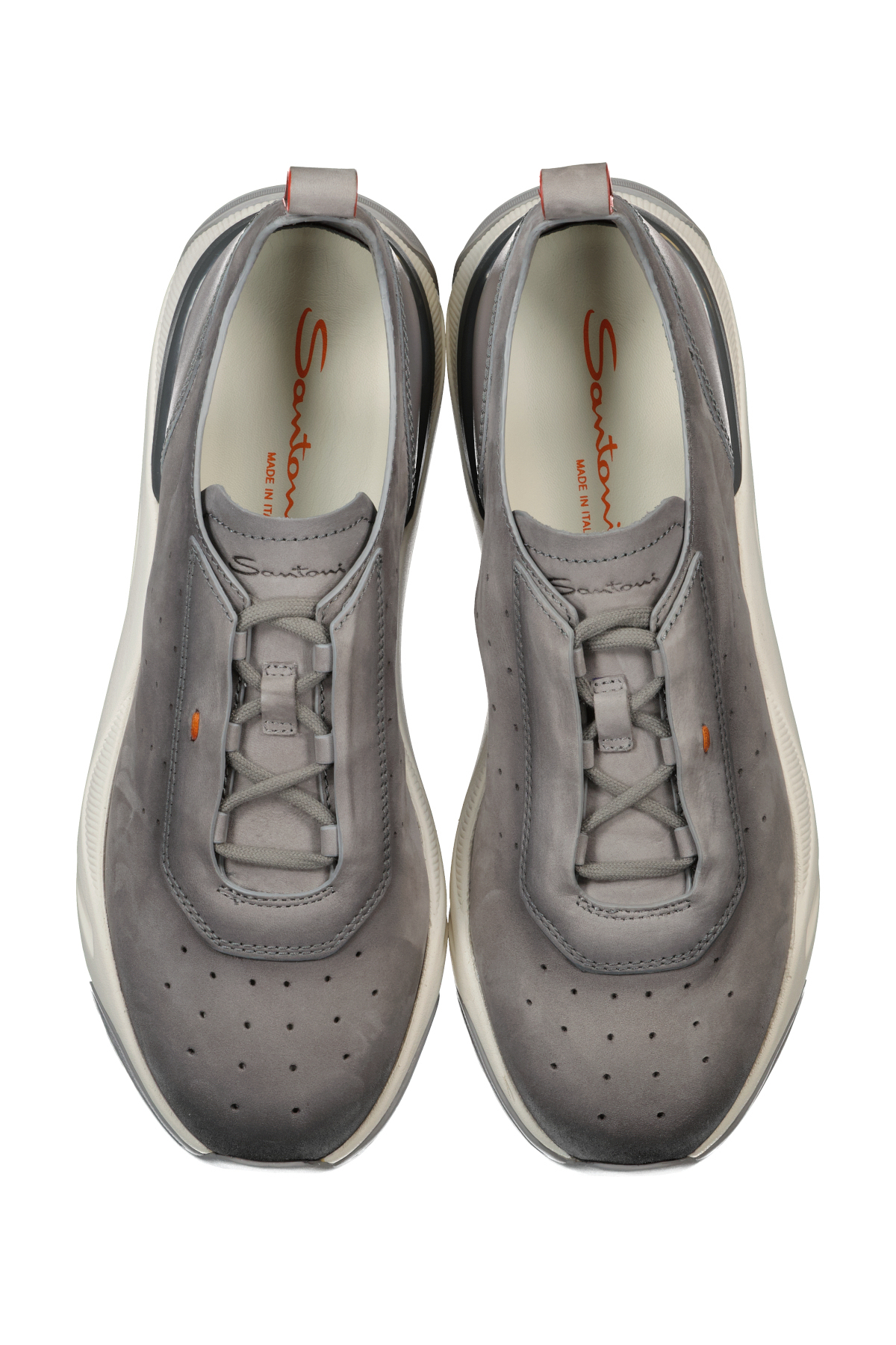Grijze veterschoenen voor heren van Santoni. Dit model heeft een comfortabele, op hardlopen geïnspireerde lijn met een hoge rubberen zool en een taps toelopende neus met een verfijnde en moderne smaak. Het geperforeerde suède zorgt niet alleen voor een trendy uitstraling, maar ook voor een goede ventilatie. Duurzame rubberen buitenzool zorgt voor optimale grip en tractie op verschillende ondergronden. Gemaakt in Italië.