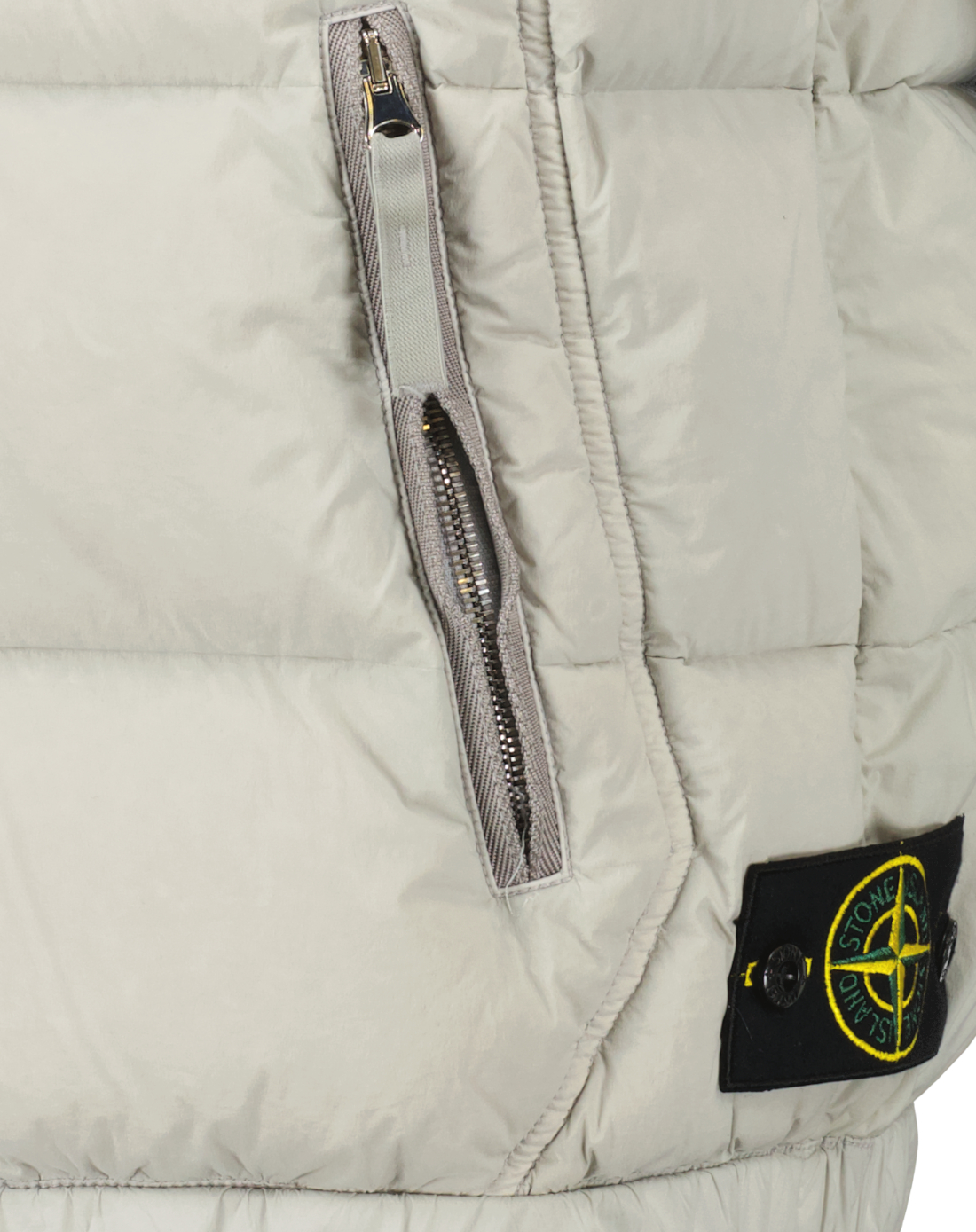 Grijze bodywarmer voor heren van Stone Island. Deze bodywarmer is gemaakt van licht gerecycled nylon dat door een speciale weeftechniek automatisch de compartimenten creëert, hierdoor worden naden vermeden, met als voordeel dat de veren in de compartimenten aanzienlijk beter vastgehouden worden. De stof ondergaat een ciré-afwerking voor een glanzende uitstraling. Verder heeft de bodywarmer zakken met een verborgen ritssluiting op de naad, de armsgaten en onderkant zijn afgezet met elastische nylon tape en een Stone Island-badge linksonder.