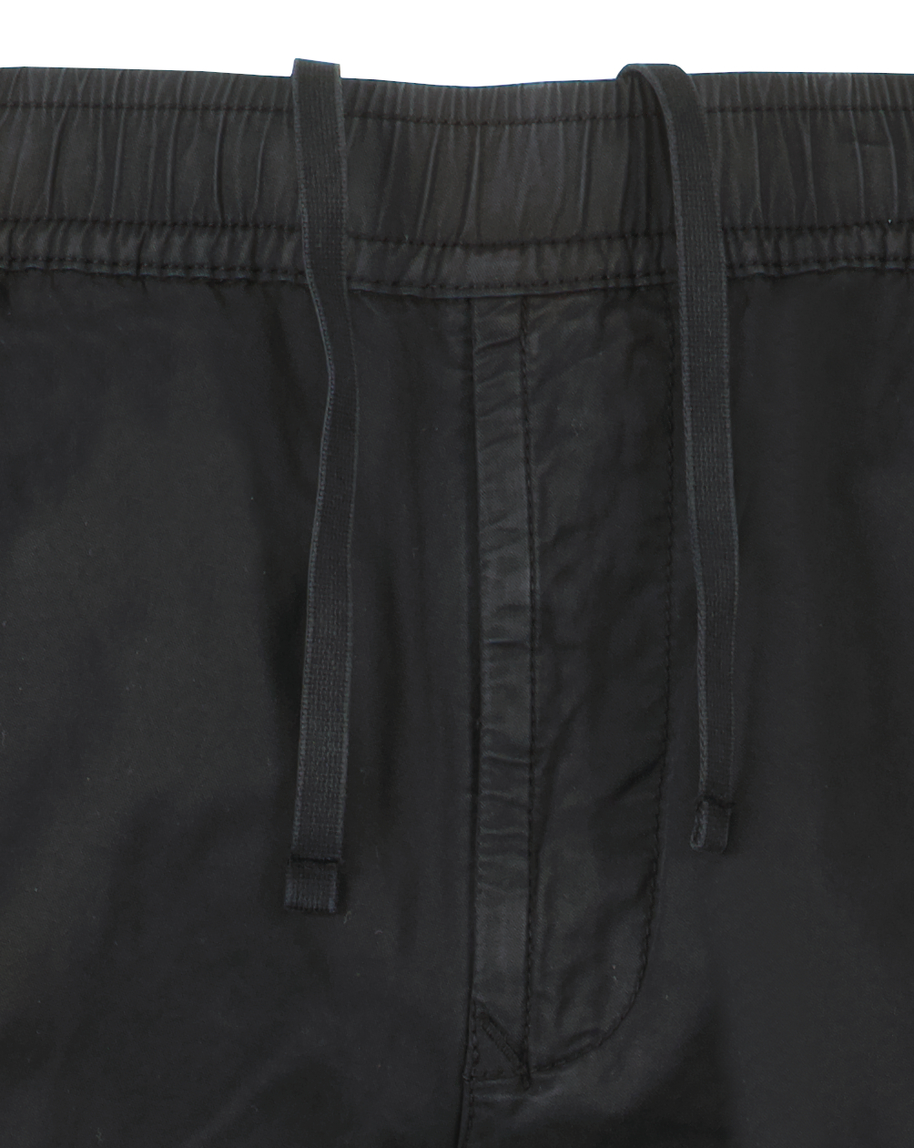 Zwarte broek voor heren van Stone Island. Normale taps toelopende pasvorm. Steekzakken op de naad. Een schuine steekzak aan de achterkant, met verborgen drukknoopsluiting. Een opgestikte zak op elk been, met klep, klittenband en drukknopen; de linker zak is voorzien van de Stone Island-badge. Gevormde knie. Elastische band aan de onderkant van de pijpen. Elastische tailleband met trekkoord aan de binnenkant en een ritssluiting.
