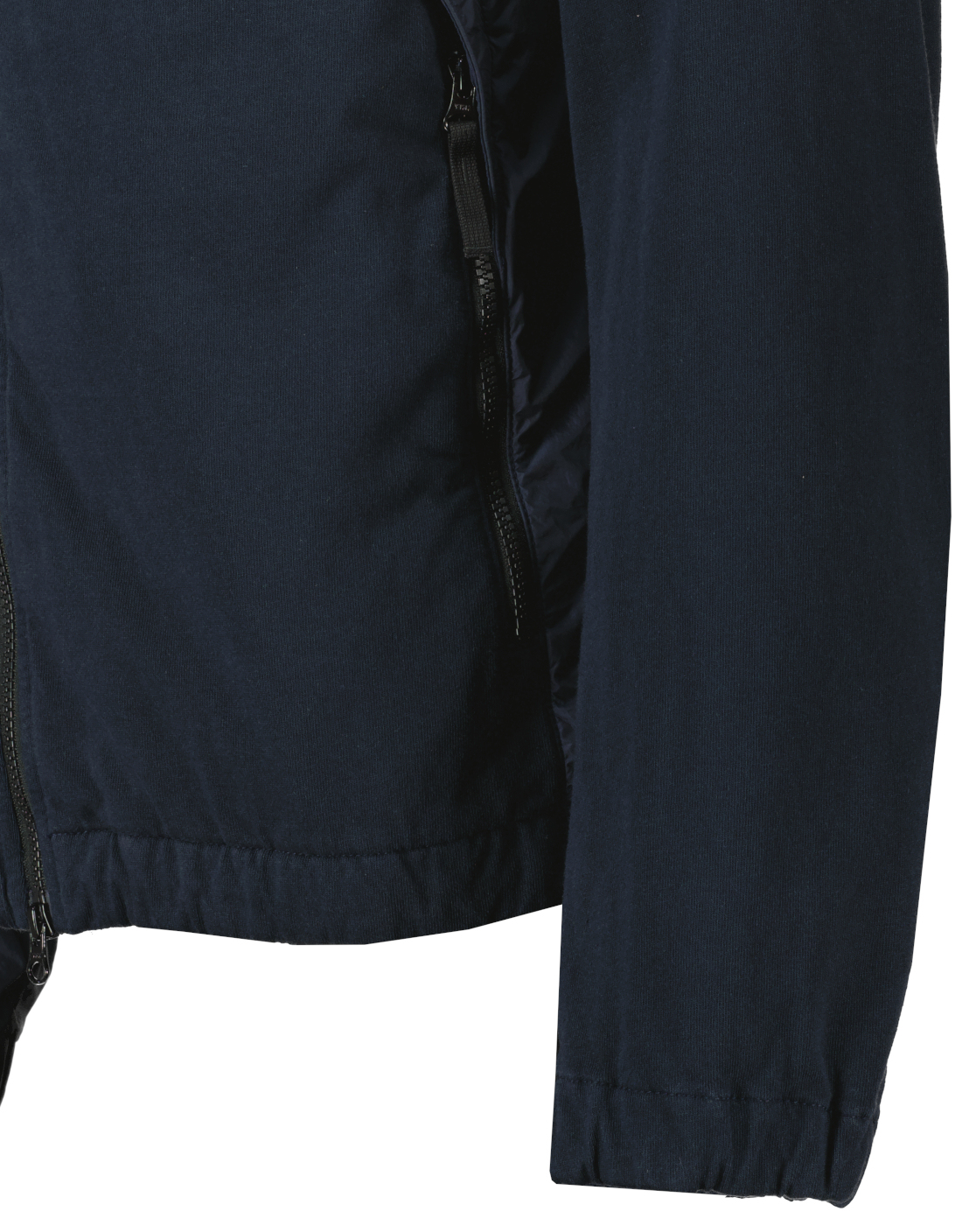 Donkerblauwe jas voor heren van Stone Island. De jas heeft een capuchon gevoerd met katoenen jersey met elastische rand, een afgeronde klep op de borst met opstaande steekzakken aan de zijkanten met ritssluiting, een Stone Island-badge op de linkermouw, heeft elastische manchetten en onderband, een juk op de rug en heeft een tweewegritssluiting.