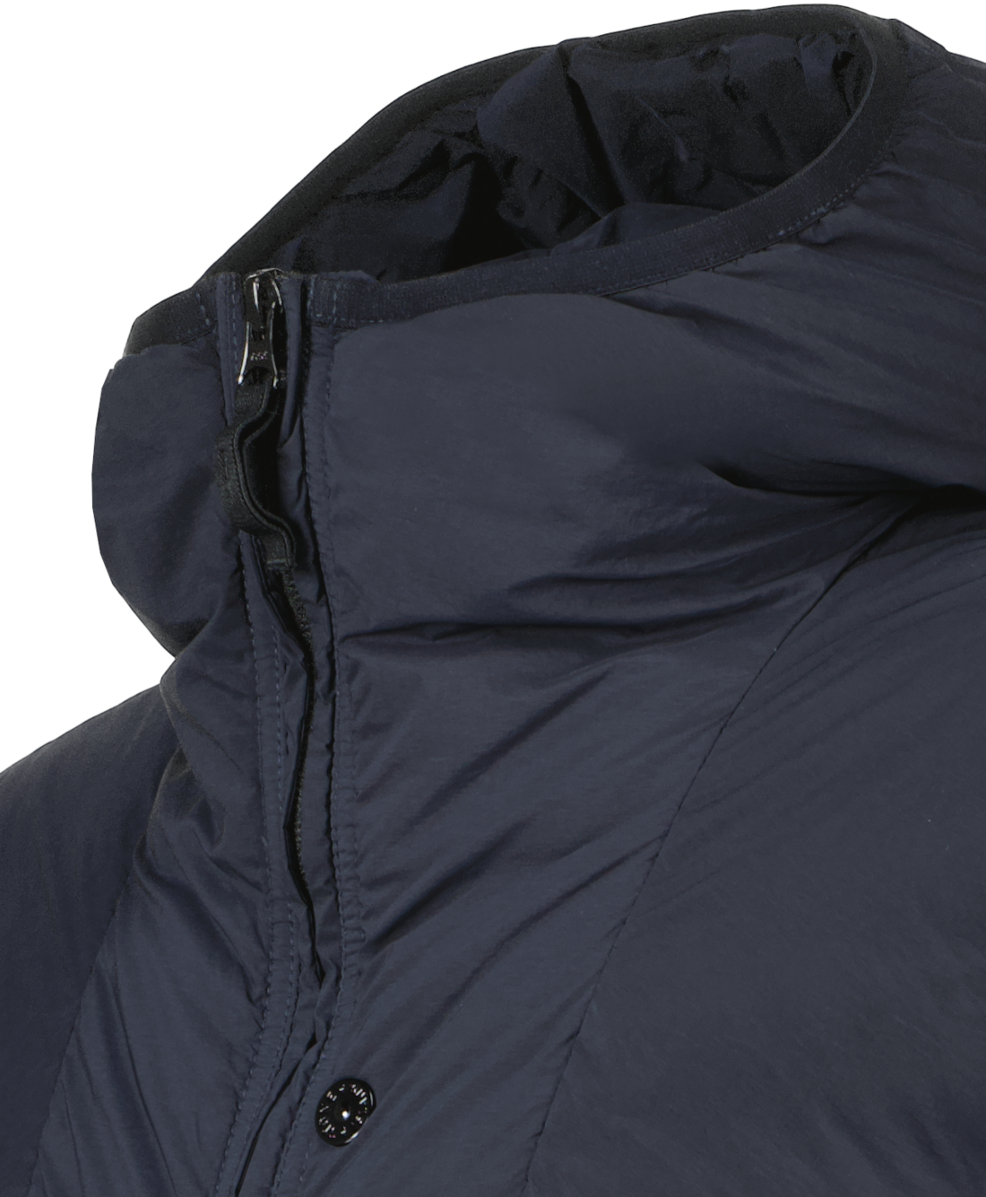 Donkerblauwe jas voor heren van Stone Island. Dit donsjack is gemaakt van een enkele laag licht stretchnylon met naadloze tunnels voor een betere verenondersteuning, met een gewatteerde capuchon en onzichtbare ritszakken. Garengeverfd met anti-druppelsysteem. Heeft een regular fit.