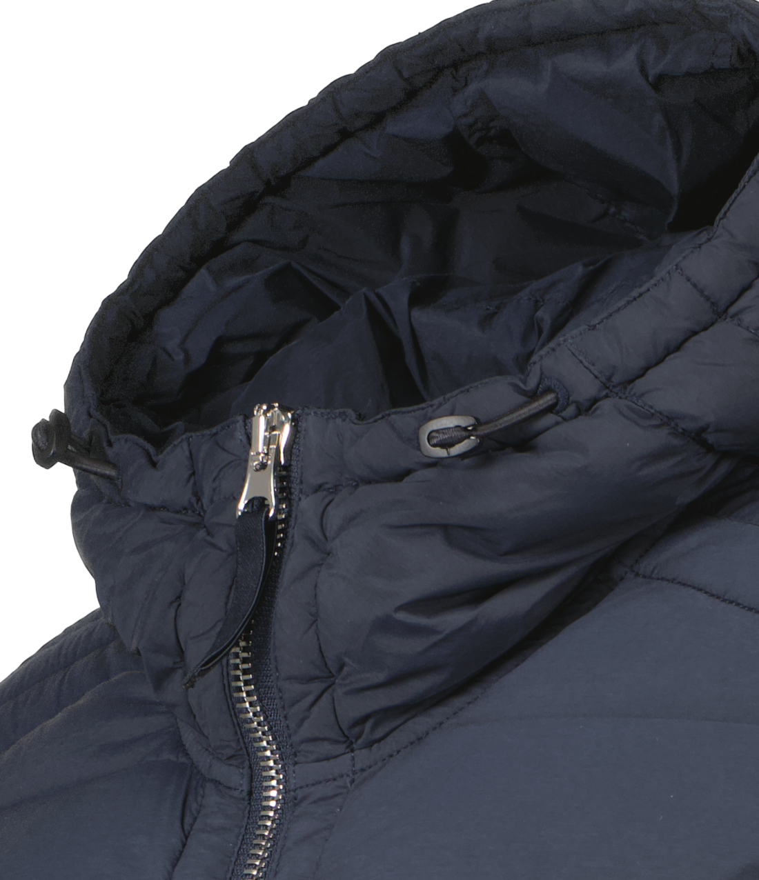 Donkerblauwe jas voor heren van Stone Island. Dit donsjack met capuchon is gemaakt van een lichte, elastische nylon stof met één laag. De jas is gevuld met directe injectie van de fijnste veren, speciaal behandeld met een anti-druppelmiddel. Gecertificeerd volgens RDS - Responsible Down Standard.