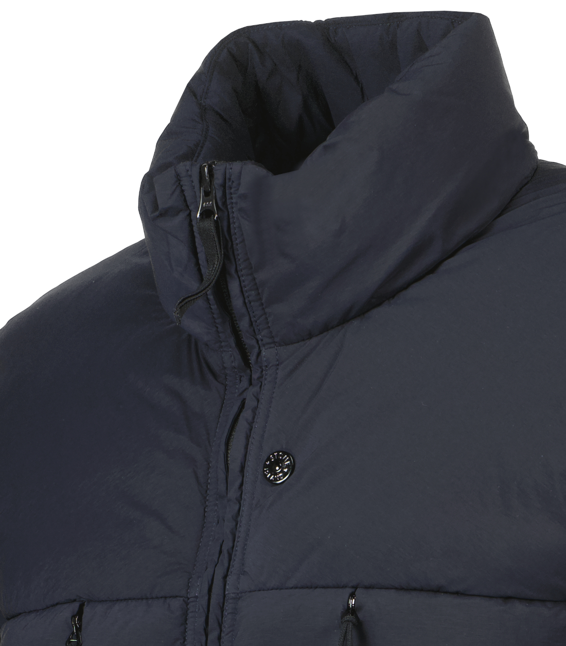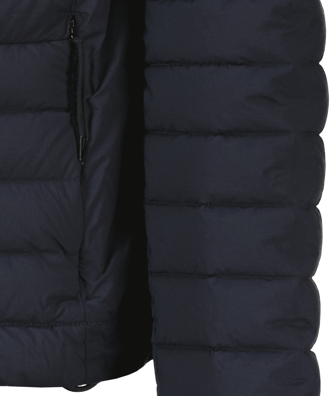 Lichtgewicht down jacket met opstaande kraag, uitgevoerd in een single layer stretchstof van 86% gerecycled nylon. Dankzij een speciale weeftechniek worden de donstunnels naadloos direct in de stof gevormd, wat zorgt voor een betere verdeling en extra behoud van de donsisolatie. De jas is gevuld via directe injectie met hoogwaardige veren die speciaal zijn behandeld voor garment dyeing.