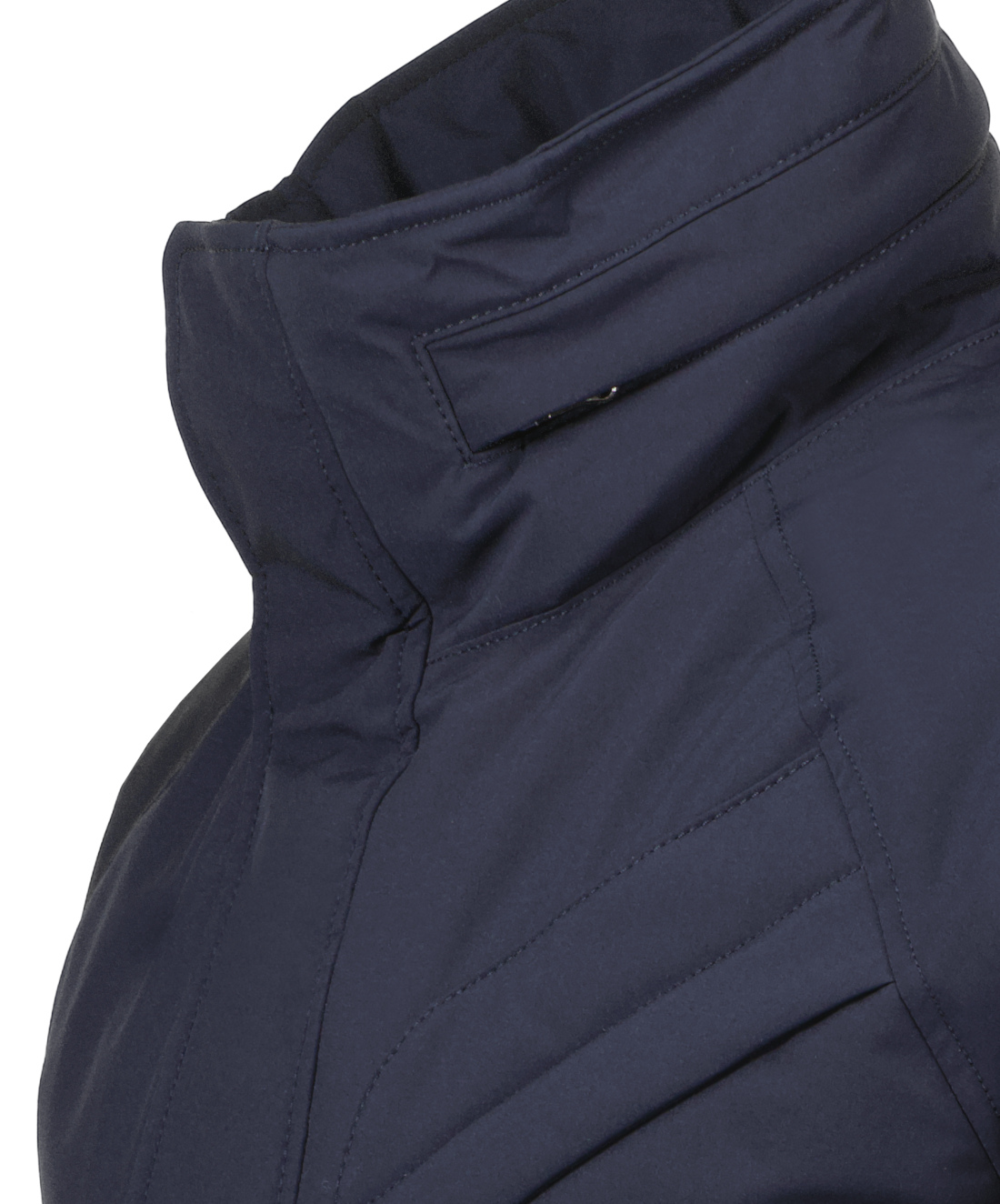 Donkerblauwe jas voor heren van Stone Island. Deze lange jas met capuchon is gemaakt van een tweelaags materiaal, de buitenkant van gerecycled polyester stretchcanvas is geweven met garens met behulp van de e.dye® Waterless Color System™-technologie, het innovatieve systeem voor kleurverzadiging van garens. De stof is gelamineerd op een ademend, wind- en waterbestendig membraan. De jas is gevoerd met een binnenlaag van PrimaLoft® Gold P.U.R.E™, een exclusieve 100% gerecyclede mix van vezels met een ultrakleine diameter, wat resulteert in superieure thermische prestaties. De jas is behandeld met een anti-druppelmiddel.