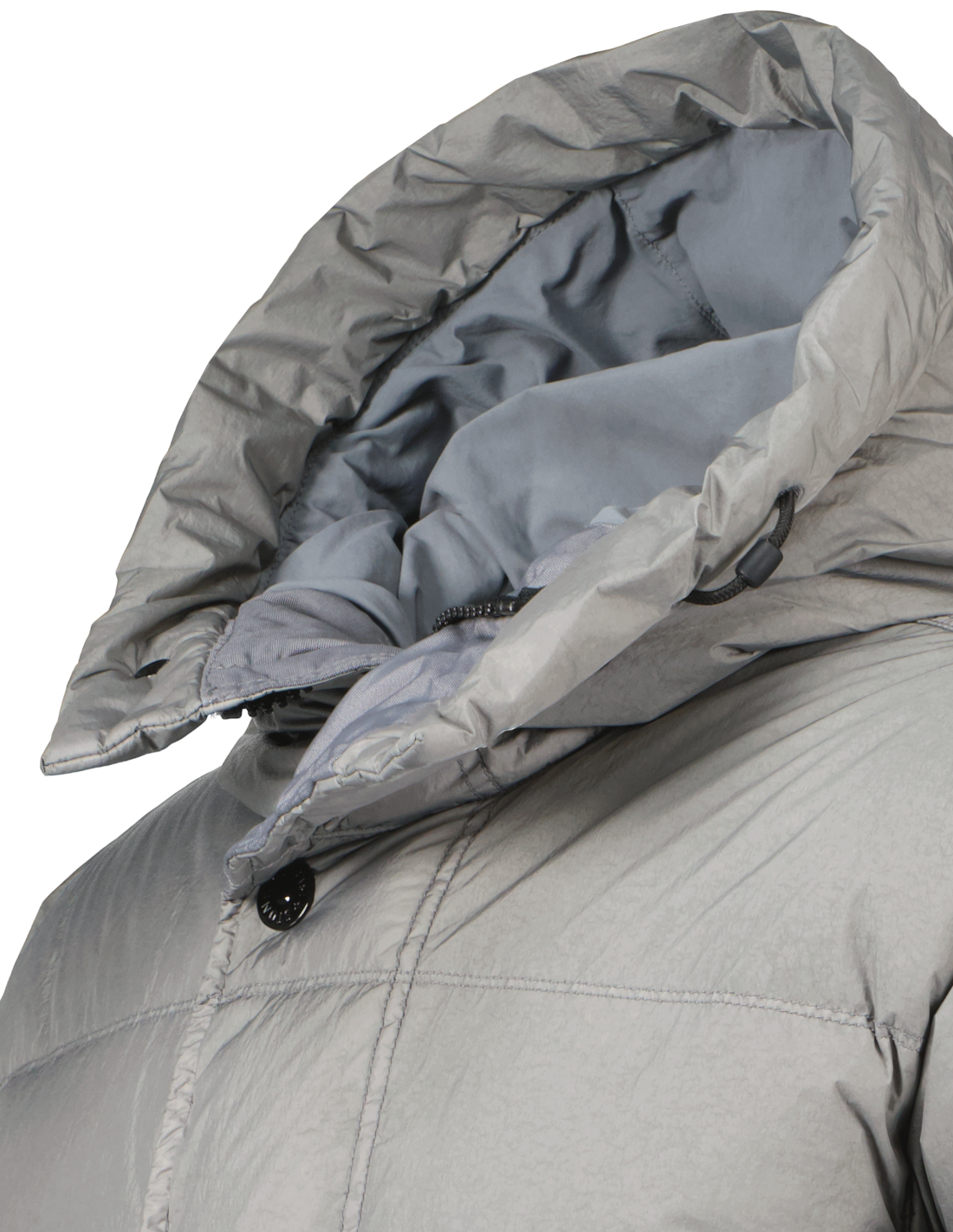 Grijze jas voor heren van Stone Island. Deze donsparka met capuchon is gemaakt van licht gerecycled nylon met een ultrastrakke weefconstructie. De harscoating aan de binnenkant maakt hem winddicht en licht waterafstotend. Door de harsbehandeling van het materiaal dringt de kleur ongelijkmatig in het materiaal door, waardoor het oppervlak een gekreukt uiterlijk krijgt. De jas is gevoerd met de fijnste veren, speciaal behandeld om bestand te zijn tegen het verfproces.