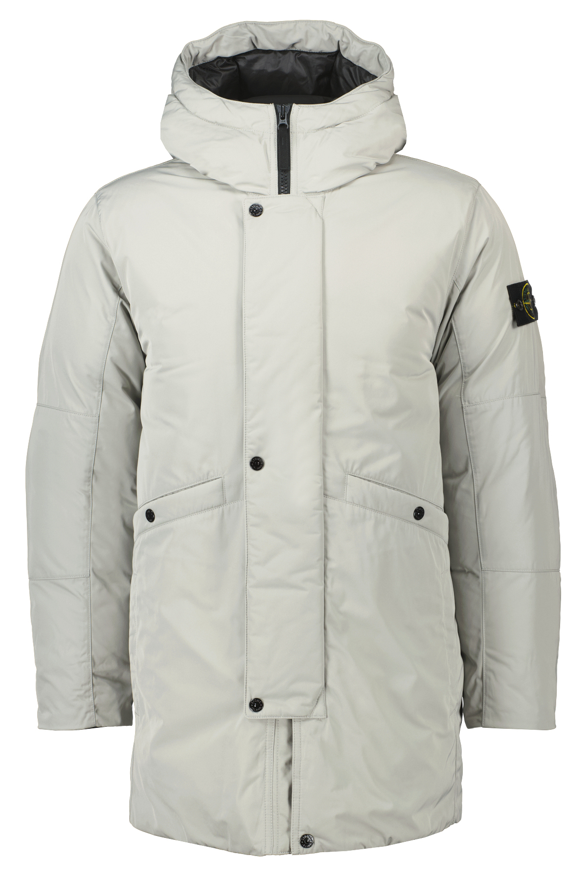 Grijze jas voor heren van Stone Island. Deze donsparka met capuchon, is gemaakt van polyester microtwill met een veerachtige, spiraalvormige moleculaire structuur. Deze vezel geeft de stof een zachte en comfortabele textuur met diepe en rijke kleuren. Behandeld met een anti-druppelmiddel. Gewatteerd met de fijnste veren. RDS - Responsible Down Standard-gecertificeerd.