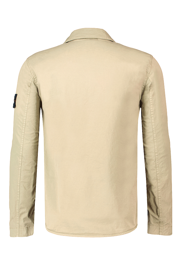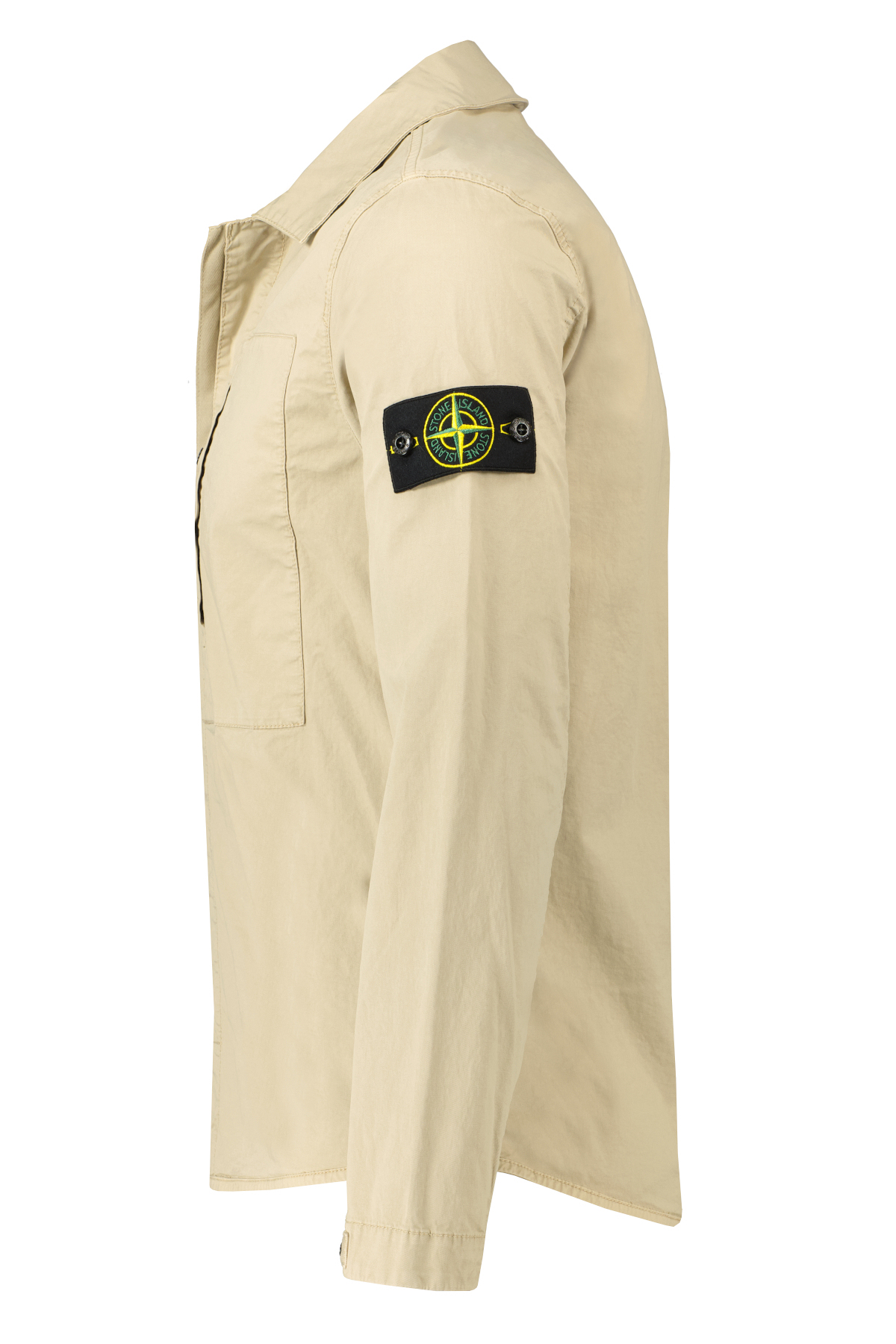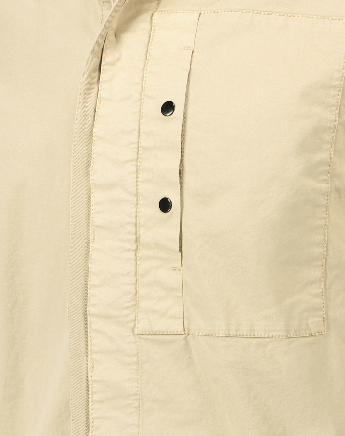 Beige overshirt voor heren van Stone Island. Overshirt van stretch Supima® katoen twill met drukknoopsluiting op de borst, verstelbare manchetten en dubbele sluiting met verborgen drukknoopsluiting. Garment dyed. Logo badge op de linkerarm. Heeft een normale pasvorm.