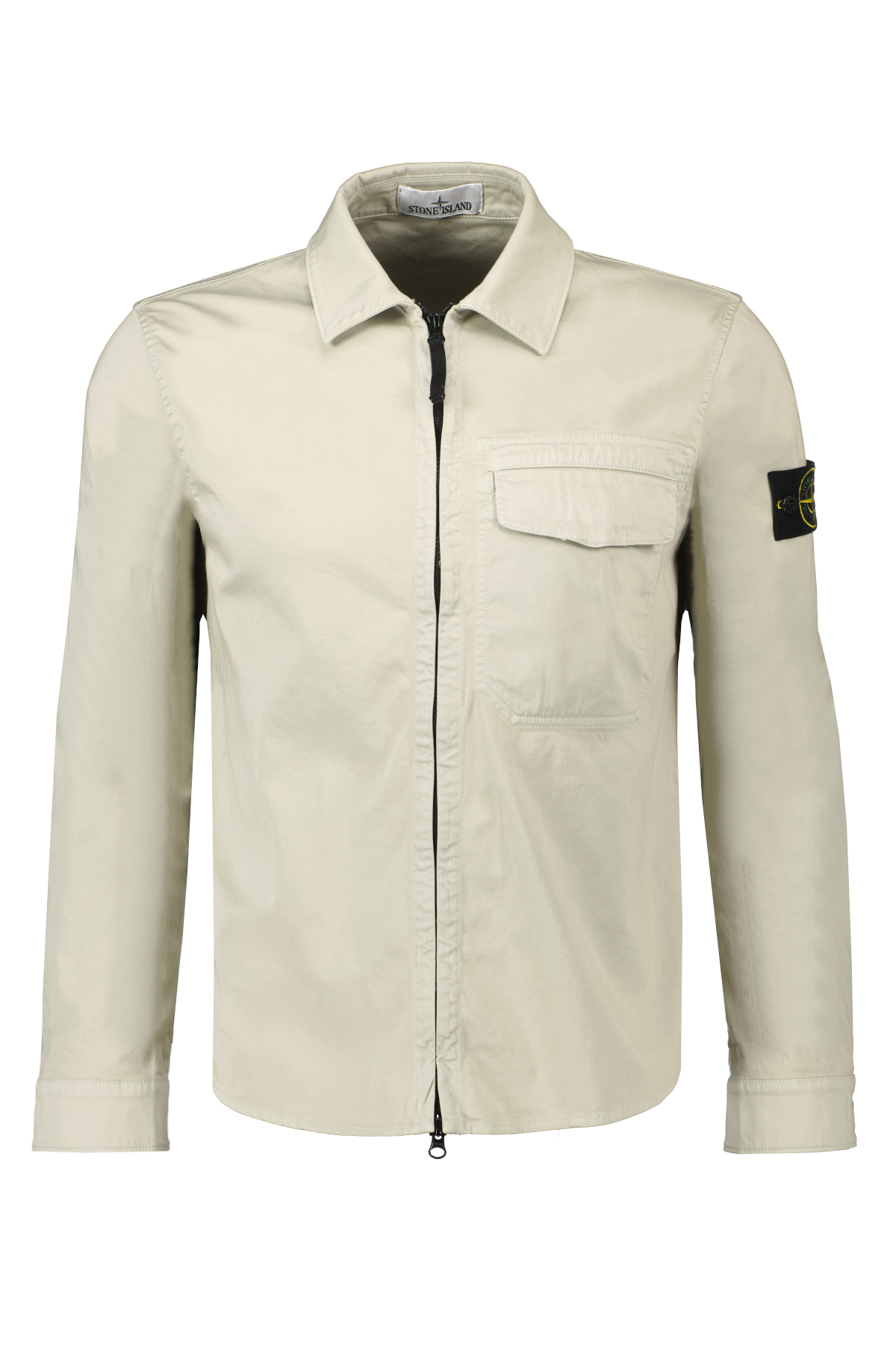 Lichtbeige overshirt voor heren van Stone Island. Dit overshirt is gemaakt van licht stretchkatoen tela, is garment dyed, heeft twee opgestikte borstzakken met klep en verborgen knoopsluiting, heeft een Stone Island-badge op de linkermouw, heeft een knoopsluiting aan de manchetten en heeft verborgen drukknoopsluiting op katoenen tape.