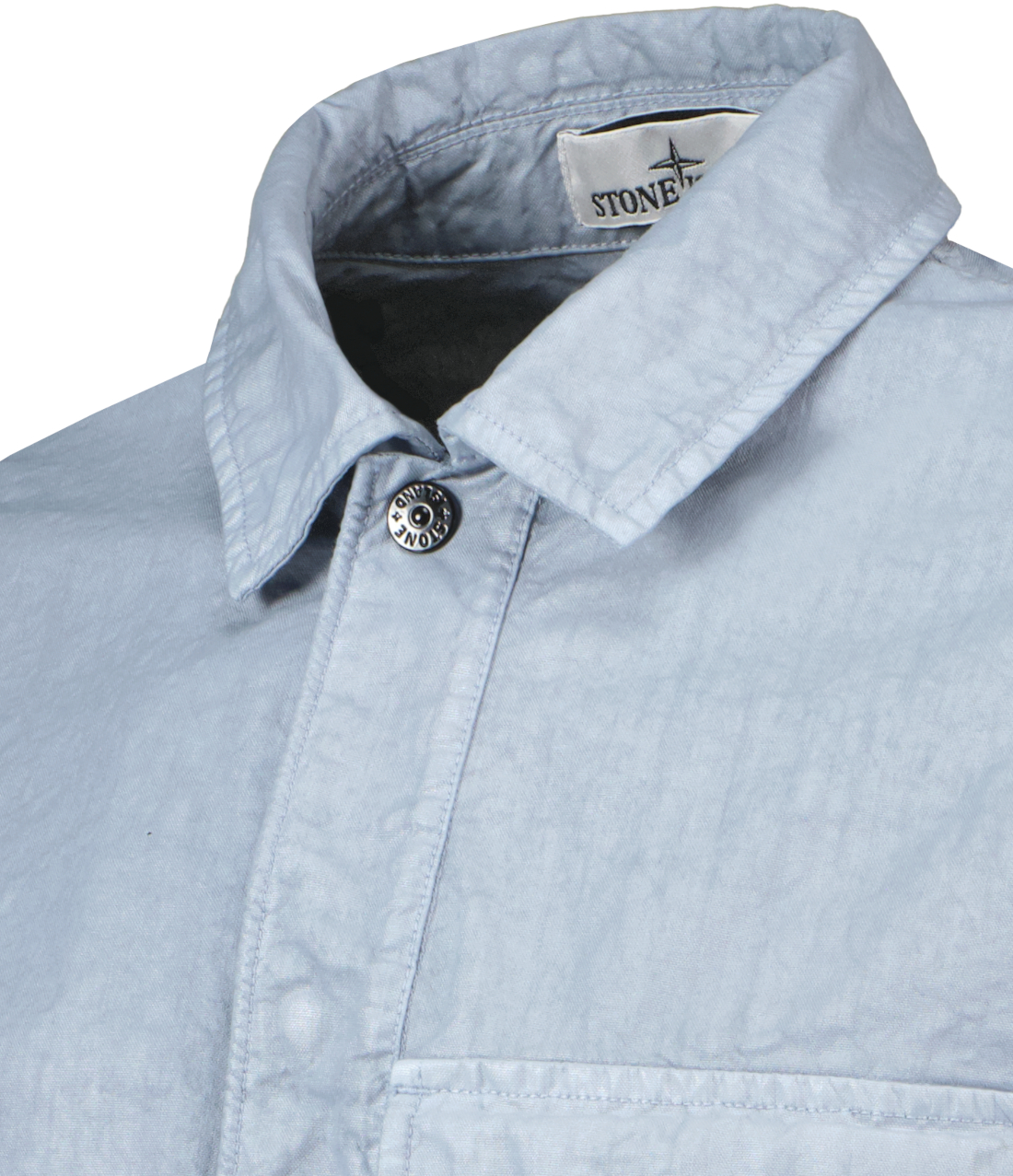 Blauwgrijs overshirt voor heren van Stone Island. Dankzij de garment dyeing techniek krijgt het materiaal een gemarmerde uitstraling door de ongelijkmatige kleuropname. Afgewerkt met een borstzak met klep en verdekte dubbele drukknopen, verstelbare manchetten, een semi-verdekte drukknoopsluiting en de herkenbare Stone Island badge op de linkermouw.