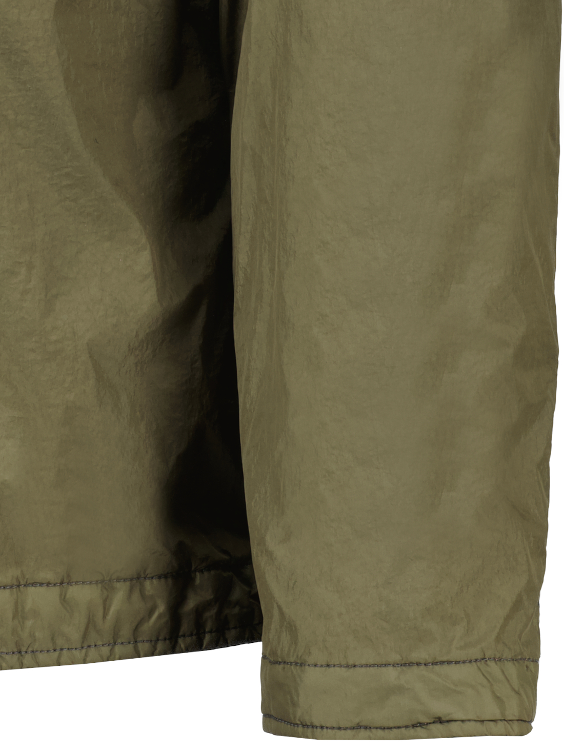 Het overshirt is uitgevoerd in licht gerecycled nylon rep met een zeer dichte weving. De harscoating aan de binnenzijde maakt het item winddicht en licht waterafstotend. Door de resinbehandeling dringt de kleur ongelijkmatig in het materiaal, wat zorgt voor een licht gekreukte uitstraling.
