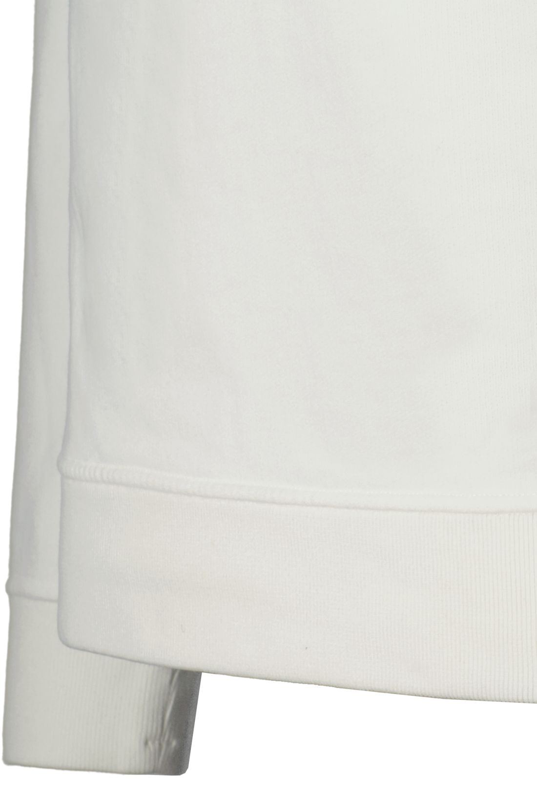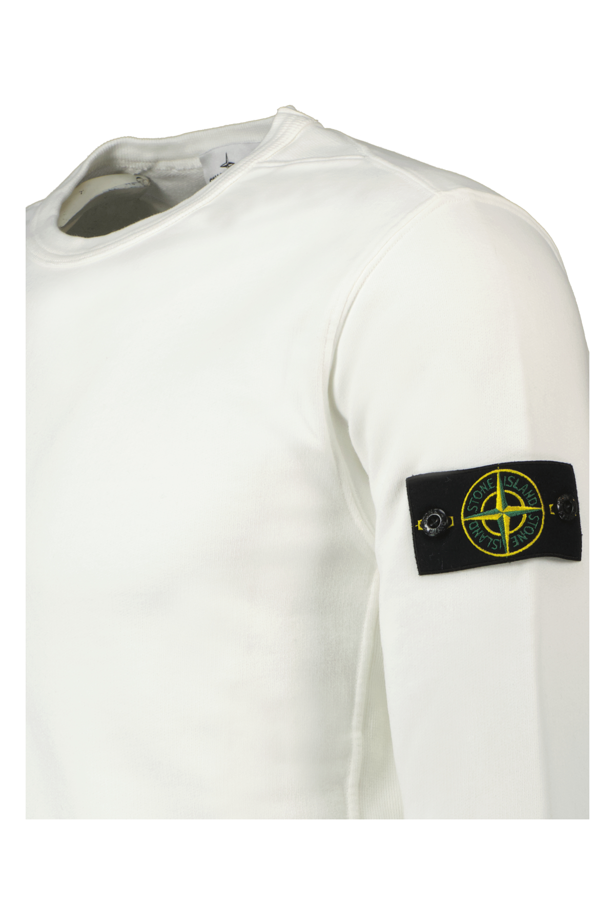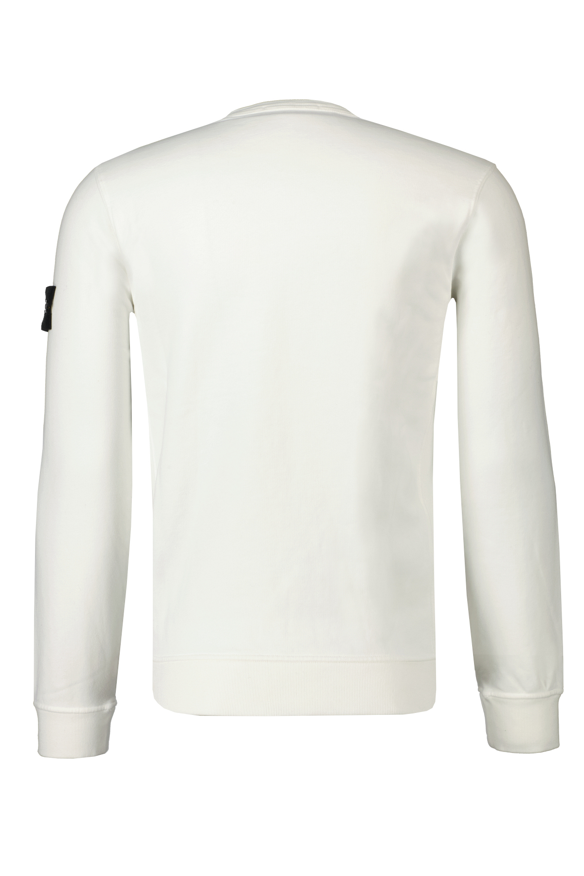 Witte sweater van Stone Island. De sweater heeft een lichte stretch, een geribbelde ronde hals, geribbelde manchetten en onderband en het Stone Island logo op de linkerarm.