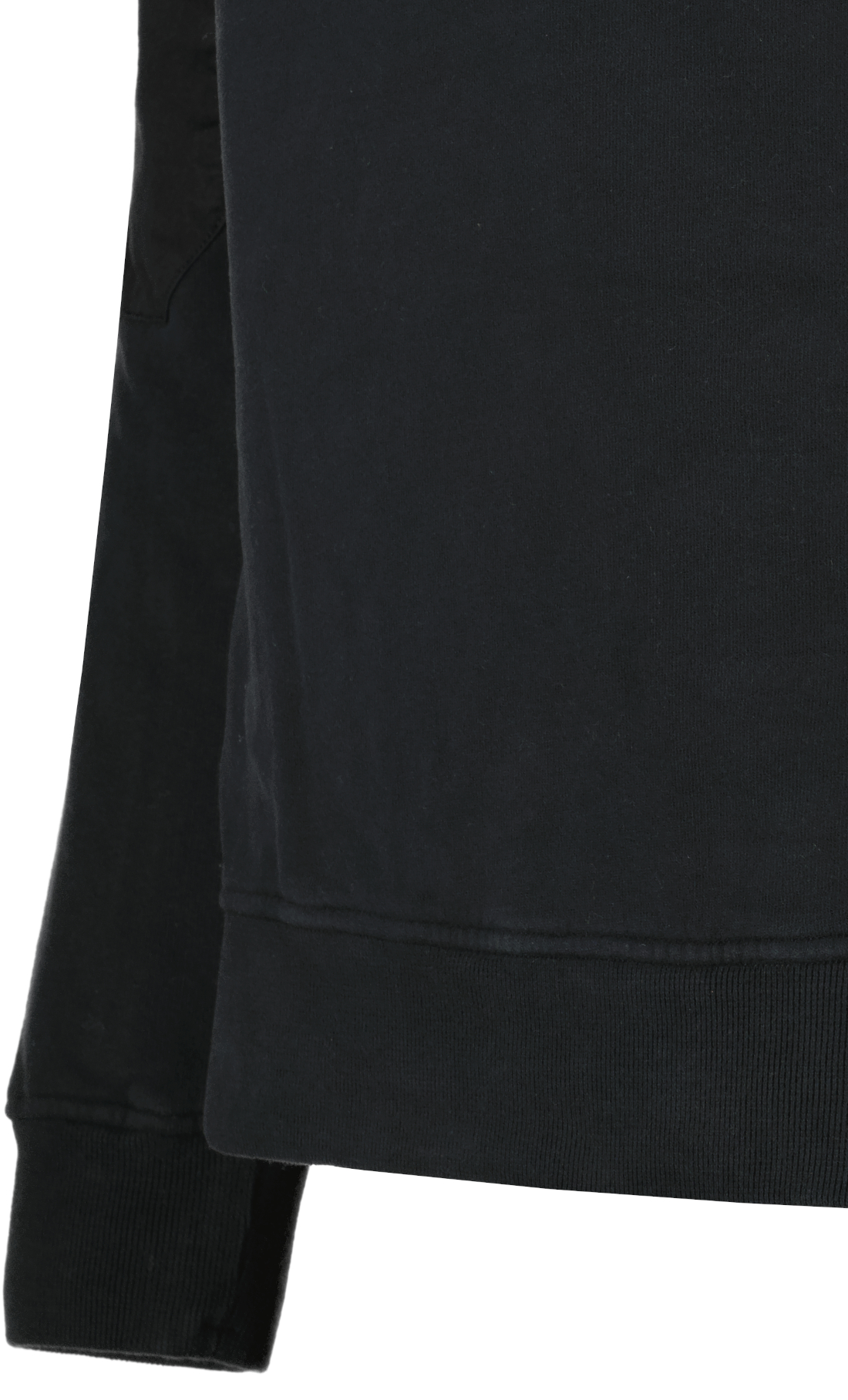 Zwarte sweater van Stone Island. De sweater heeft een geribbelde halslijn, een patch van katoenen keperstof op de mouwen, de linker met plooizak bovenaan, klep en drukknoopsluiting; op de zak staat het Stone Island-embleem. Geribde manchetten en onderband en een normale pasvorm.