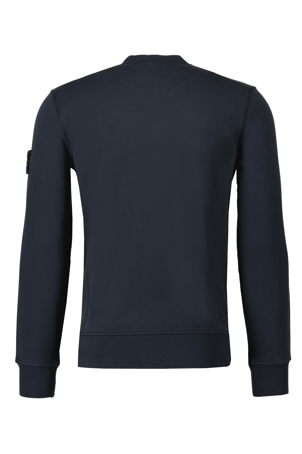 Donkerblauwe trui van Stone Island met ronde hals en logopatch op de linkerarm. De trui is gemaakt van katoenfleece, is geverfd, heeft een geribbelde halslijn, een Stone Island-badge op de linkermouw, overlocknaden, Lunette onder de halslijn met binnen voering op de rug en geribde manchetten en onderband.