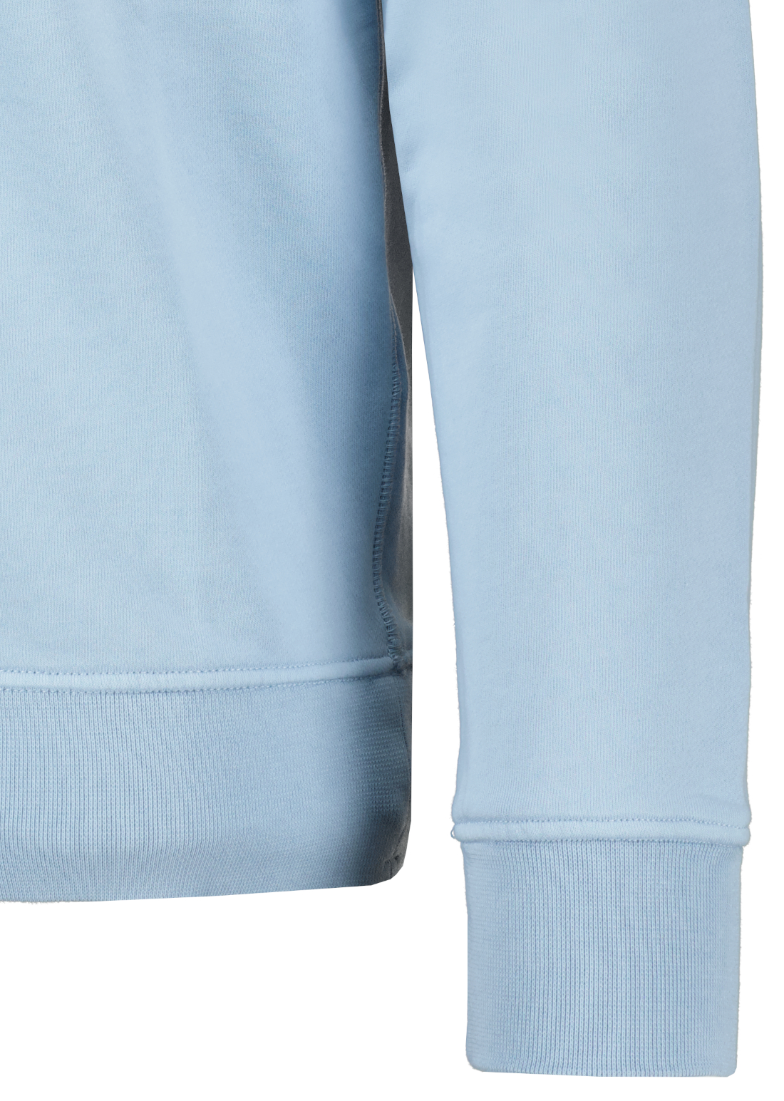 Blauwe trui van Stone Island met ronde hals en logopatch op de linkerarm. De trui is gemaakt van katoenfleece, is geverfd, heeft een geribbelde halslijn, een Stone Island-badge op de linkermouw, overlocknaden, Lunette onder de halslijn met binnenvoering op de rug en geribde manchetten en onderband.