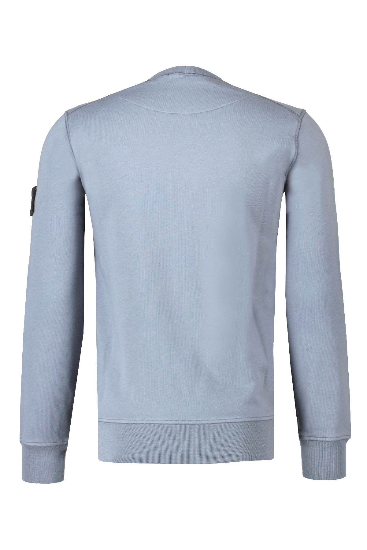 Blauwe trui van Stone Island met ronde hals en logopatch op de linkerarm. De trui is gemaakt van katoenfleece, is geverfd, heeft een geribbelde halslijn, een Stone Island-badge op de linkermouw, overlocknaden, Lunette onder de halslijn met binnenvoering op de rug en geribde manchetten en onderband.