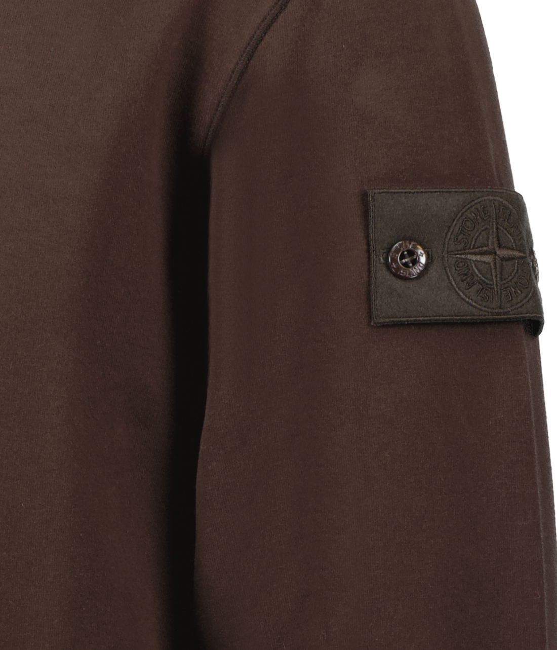 Donkerbruine sweater voor heren uit de Ghost Collectie van Stone Island. Deze sweater is gemaakt van licht stretch katoen met fleece, heeft een geribbelde halslijn, een Stone Island Ghost-badge op de linkermouw, geribbelde manchetten en onderband. Heeft een comfortabele pasvorm.