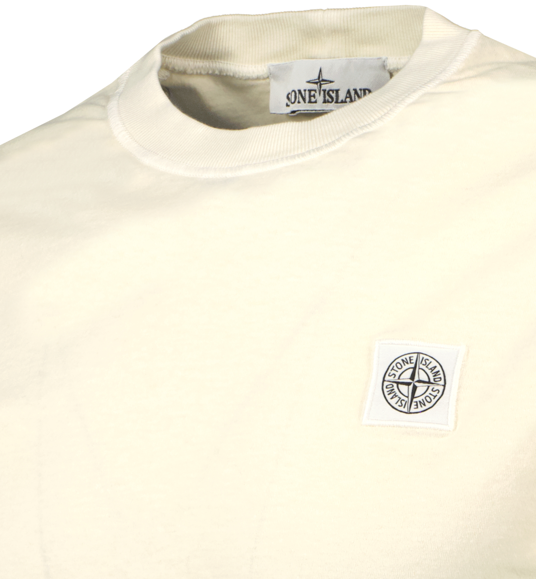 Lichtbeige T-shirt met korte mouwen voor heren van Stone Island. Dit T-shirt met korte mouwen is gemaakt van biologisch katoenen jersey, garment dyed en behandeld met het 'FISSATO'-effect, een behandeling met wateroplosbare hars en een verftechniek voor kleding die een driedimensionaal effect creëert.